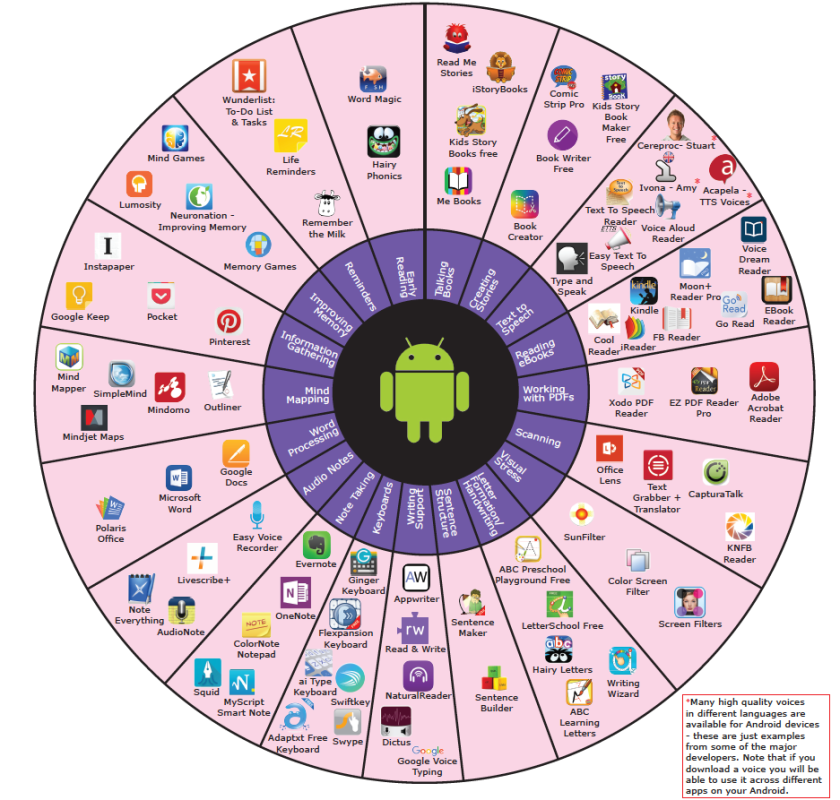 Die Universiteit van Edinburgh, Skotland, het in 2015 ‘n visuele dokument (android-apps-for-learners-with-dyslexia) geskep waarin verskeie toeps, wat gebruik kan word om kinders wat lees- en skryfprobleme ervaar te help, voorgestel word.