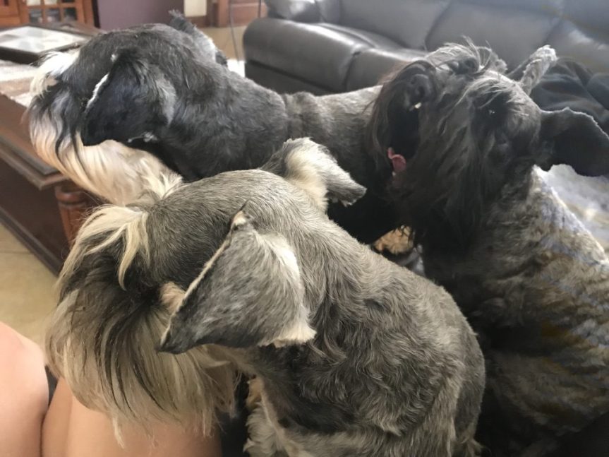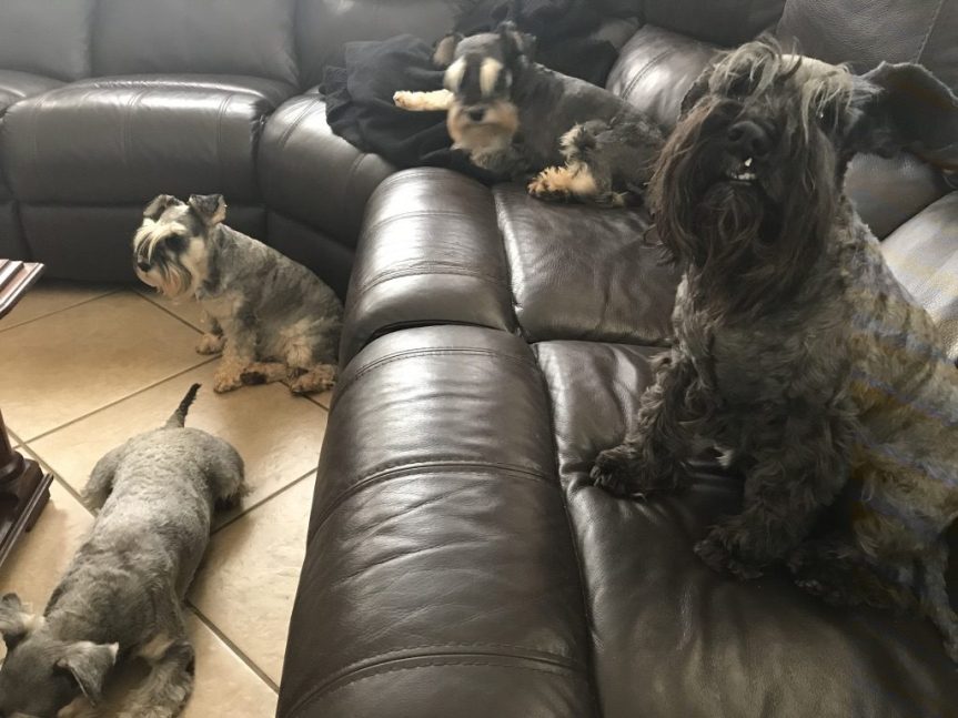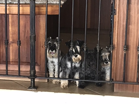 Die van julle wat ook Schnauzers het, sal weet dat hierdie menshondjies oral is waar jy is. Hulle volg jou in so ‘n mate, dat ek dikwels wonder of hulle oorsaak van ‘n gebreekte nek, bene of arms gaan wees. Want hulle bly by jou terwyl jy stap, gaan staan as jy gaan staan en wag reg voor my voete as ek te stadig met die trappe afgaan. So naby, dat ek hulle soms miskyk en dan mooi moet balans hou om nie te val as ene te naby aan my voete gaan staan het nie. Dit is die rede waarom hulle nie in die voorerf mag speel nie, want as hulle nie die verstaan as hulle te naby aan ‘n mens is nie, gaan hulle beslis nie verstaan dat ‘n kar se wiel hulle kan plattrap nie.