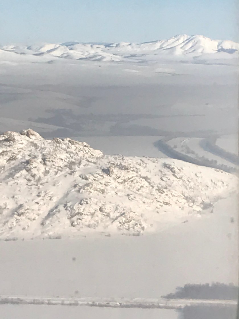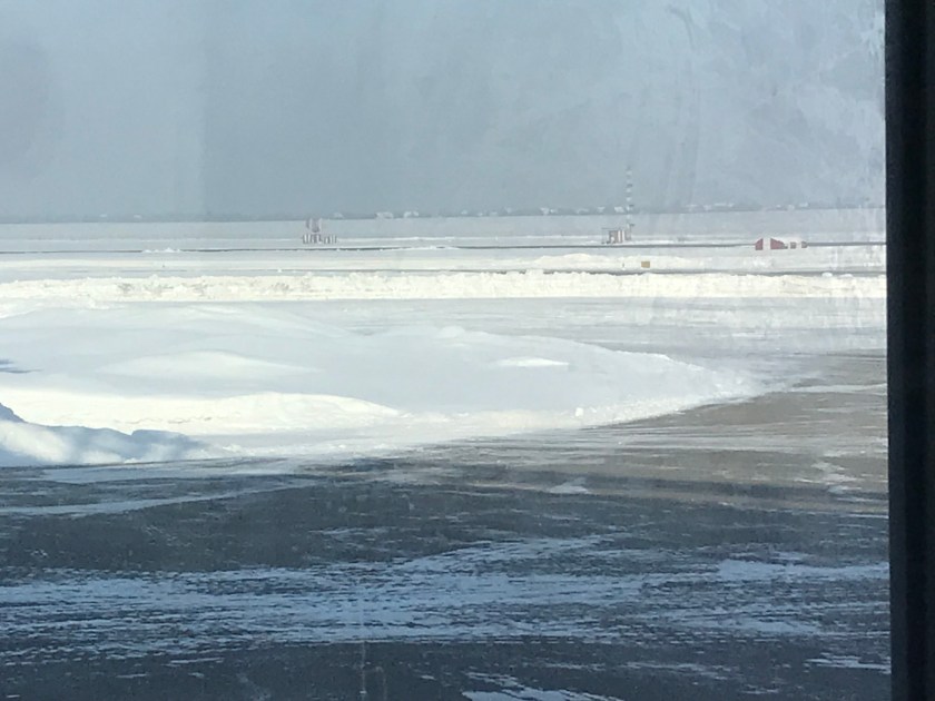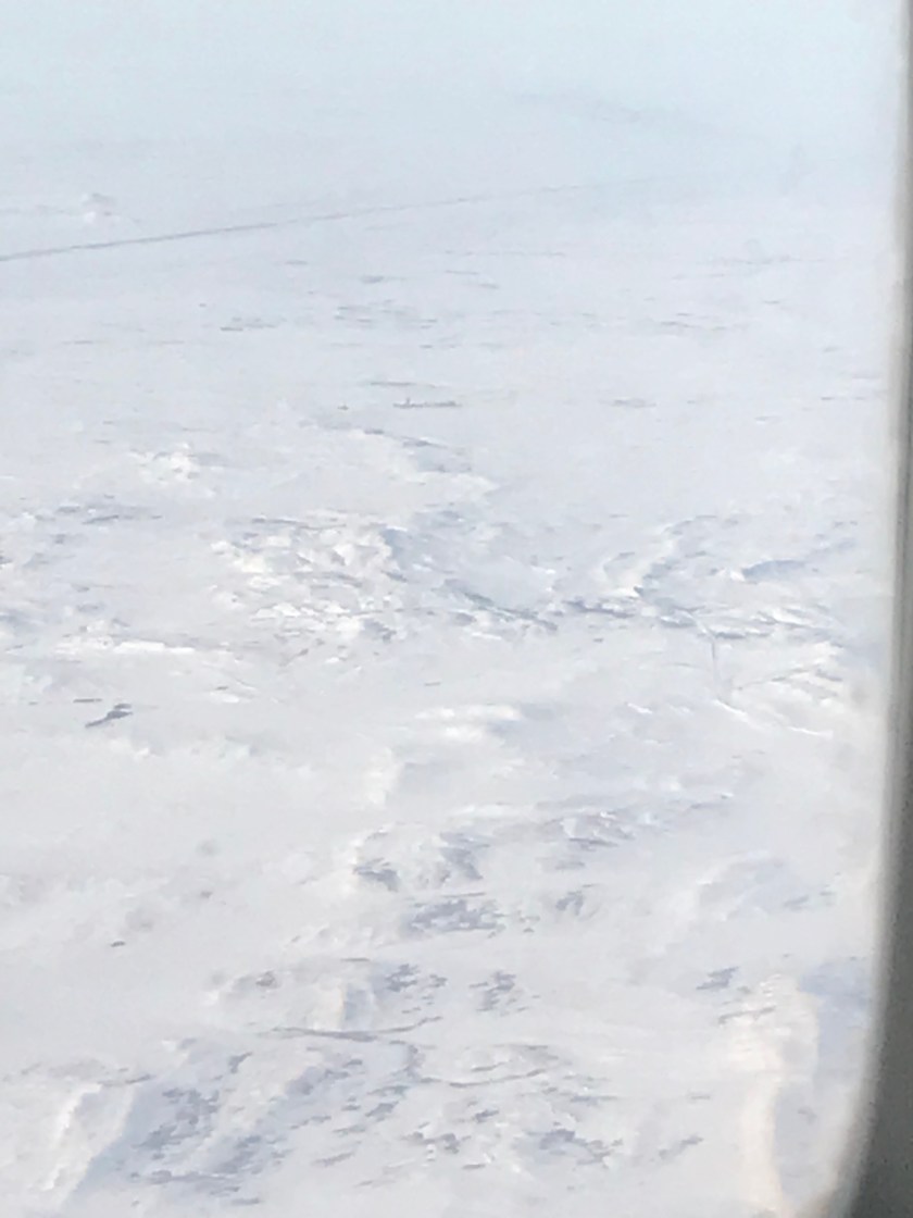 Ek het vergeet om te noem. Ons vlug is vertraag omdat dit in Ust gesneeu het. Hulle moes wag dat dit klaar sneeu en toe kon die aanloopbaan eers skoongemaak word! Genoeg om my te laat vrees dat ons van die baan gaan afgly!