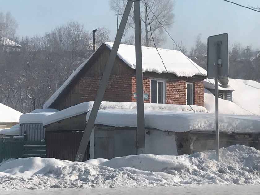 Met baie sneeu agter hom! Kyk die mooi vensters van die ou Russiese huisies!