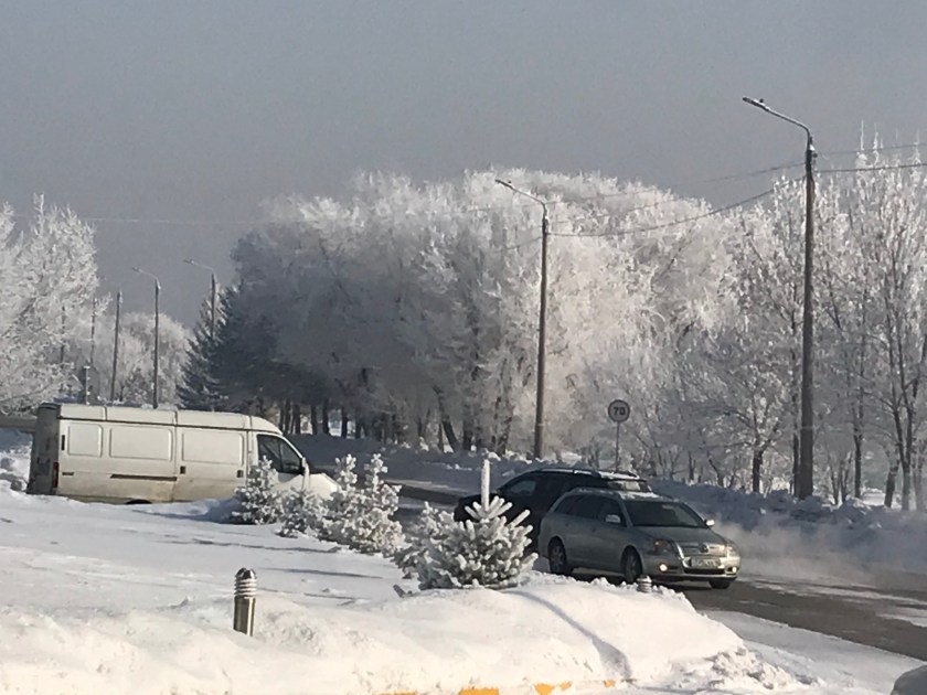Tot by die kar het my hande en neus gevries! En onverhoeds raak ek verlief op hierdie ysige stad, wat soos ‘n sprokie lyk! Kyk die pragtige wit bome.
