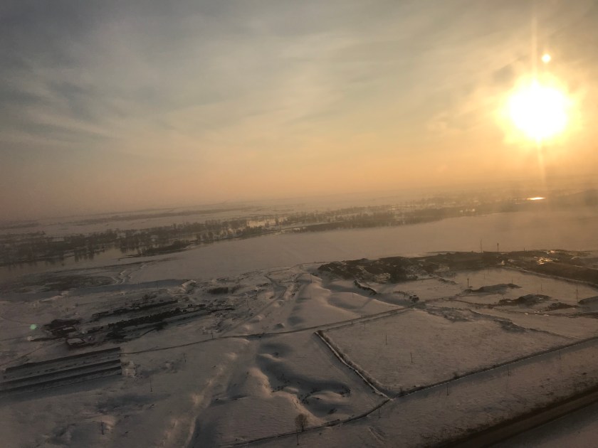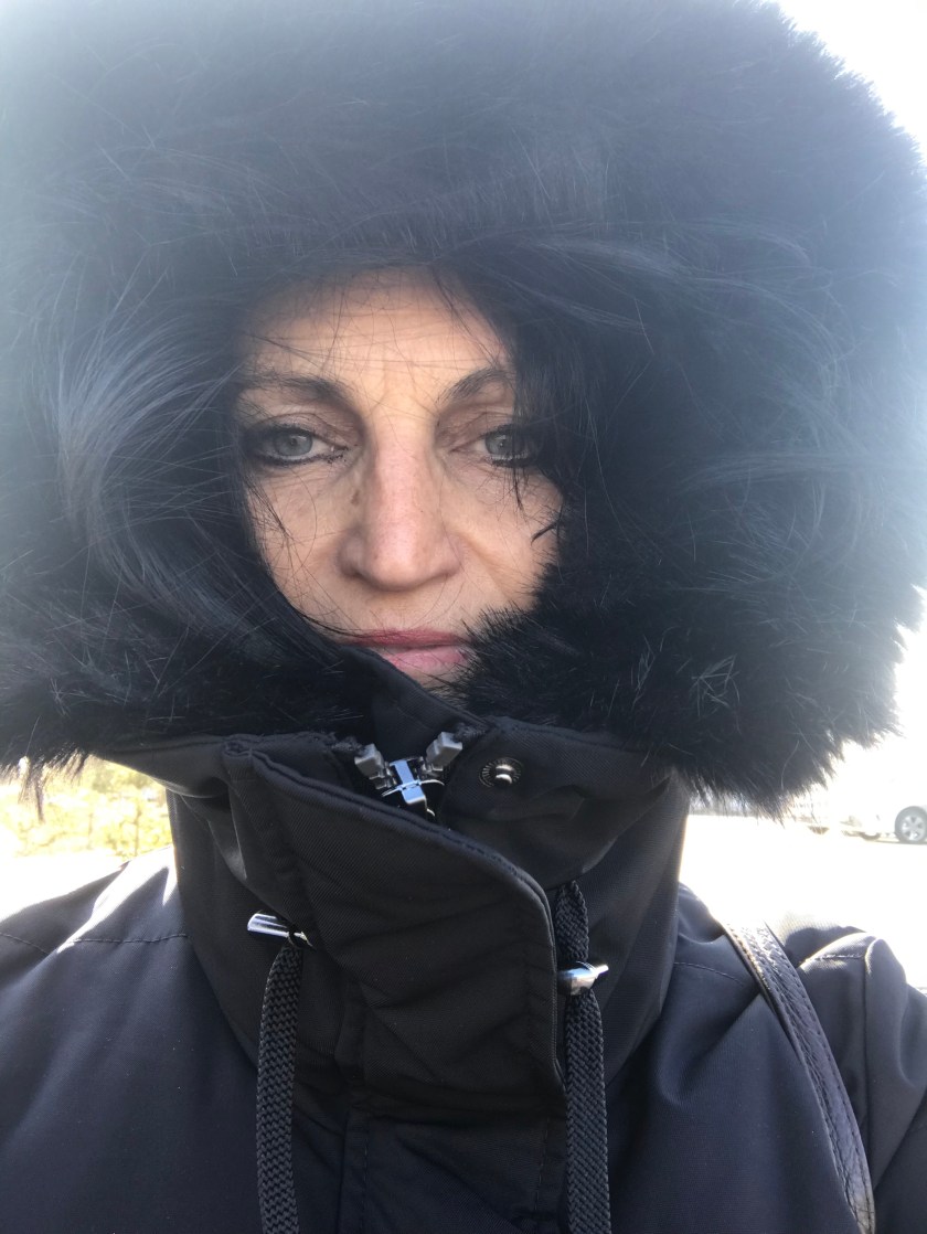 Ons vlug is byvoorbeeld vir 5 ure vertraag en dit is algemeen aan hierdie kant. Die natuur bepaal of daar veilig gevlieg kan word.Dit het so gelyk toe ons uiteindelik inkom om te land. Die moeite werd om vertraag te word as ek moet sê. Wat ‘n pragtige verwelkoming in die koue land. Die sneeu het nog dik in die strate gelê.En op plekke in hopies opgebreek. En ek het baie koud gekry as ek buite was. Mens kan dit net vir kort tydjies verduur, dan soek jy hitte.Ek vermoed die foto gee idee van hoe koud dit was. En om die woonstel was daar steeds geen speelplek vir woewe of mensekinders nie. Ek self moes op eiers loop om nie te val nie.