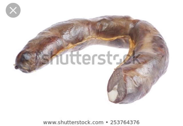 Dit is baie dik, amper soos dunnerige polonie. En die vel om dit is ‘n onnatuurlike wit. Nie eintlik deurskynend nie. Dit word in een massiewe sirkelvorm te koop aangebied en bestaan blykbaar uit lang snitte rugstring wat ingeprop word. Ek gaan beslis nie perdewors inkry sonder dat ek weet nie? Toe nie!