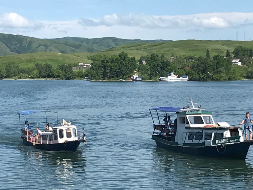 Die bootjies gee natuurlik die idee van vakansie. En speel ook lekker musiek wat ver gehoor kan word. Het ek al vertel dat ek baie tuis in Qazaqstan voel? Hulle musiek klink soos boeremusiek. Afrikaanse musiek. Ons spanbou was by hierdie soort van eilandjie wat aan die regterkant van die foto gesien kan word. Dit was besonder lekker, die twee plekke daar kan gehuur word vir kuiers en troues. Ek sal nog daarvan vertel.