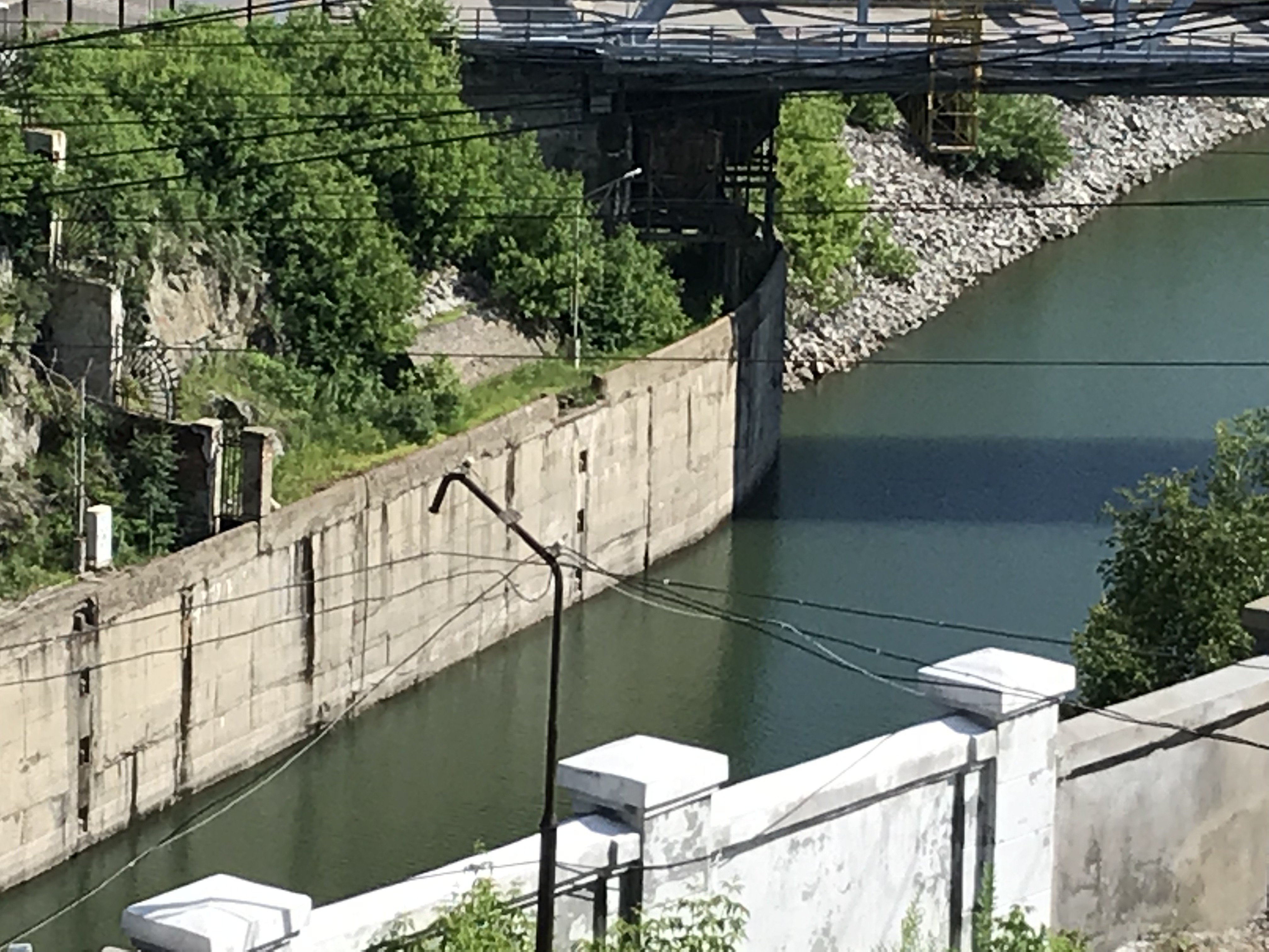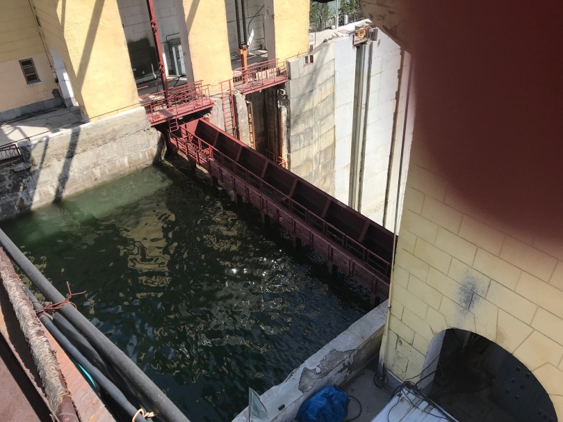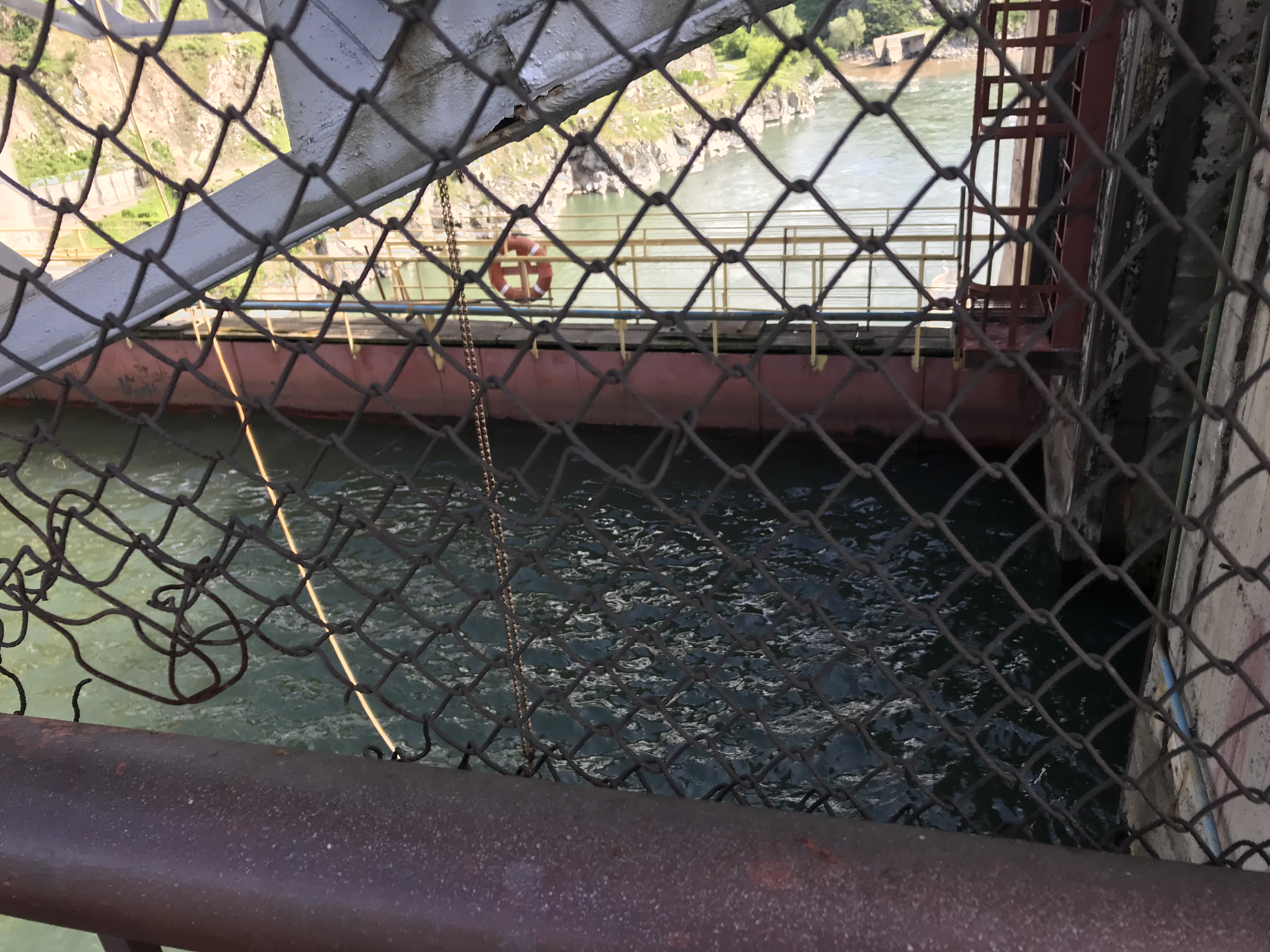 Intussen het ek meer oor die dam gaan uitvind en weer gaan foto’s neem. Die damwal is 40 m hoog en dien as plek waar hidro-elektriese krag opgewek word en as rivier slot (river lock). Ek vertel ondertoe meer van die rivierslot. Ek vertel eers meer oor die deel waar krag verwek word, naamlik die verste deel van die wal op hierdie foto, onder die groen pilare. Omdat ek gedink het dat dit die rivierslot is.