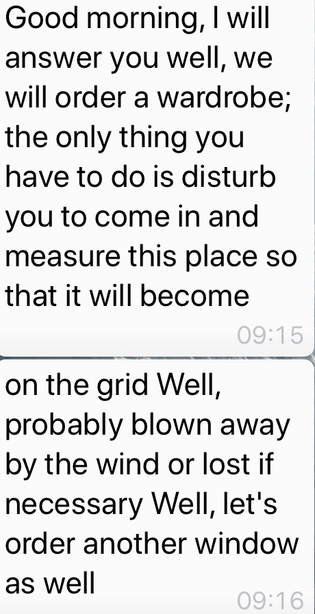 Ek het nou lekker geglimlag vir jou geselsies met jou landlord. My landlord verstaan blykbaar Engels baie goed, maar hy ly aan seletiewe geheueverlies. Dis hoekom ek met hom kommunikeer per e-pos en ek stuur elke boodskap aan al drie sy e-pos-adresse en sy WhatsApp. Soms antwoord hy.
