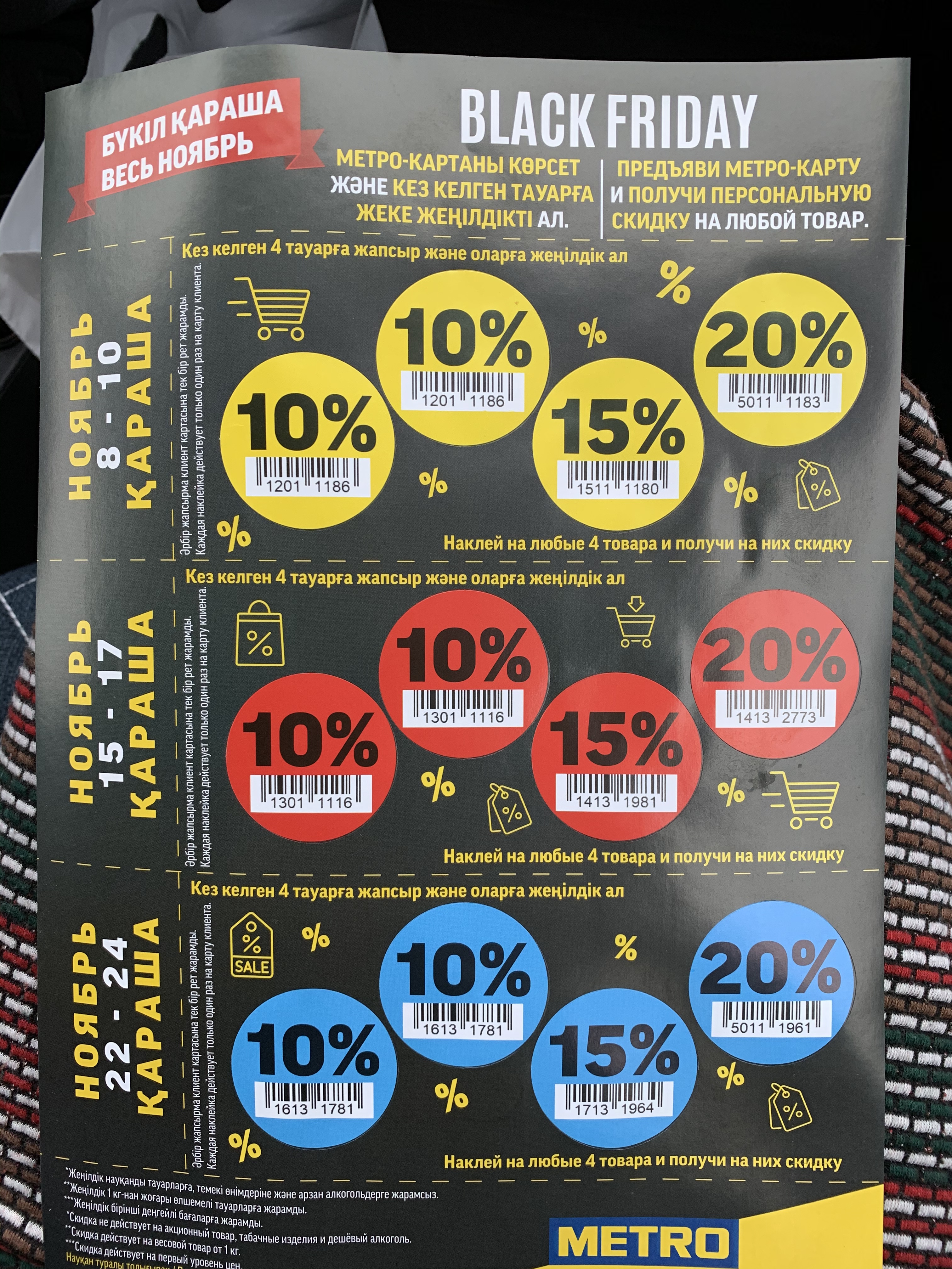 Sy wys die datums. Najabr is November. In Russies. Karasha is November, in Qazaq. Sy wys na items in ons waentjie. En sê adien. Een. Trek die 10% plakker en wys dat ek dit op een item kan plak, op daardie datums. Dan kry ek 10% afslag op die produk. Wat ek kies. Tot 20% op ‘n item. Vier items kan teen afslag gekoop word.