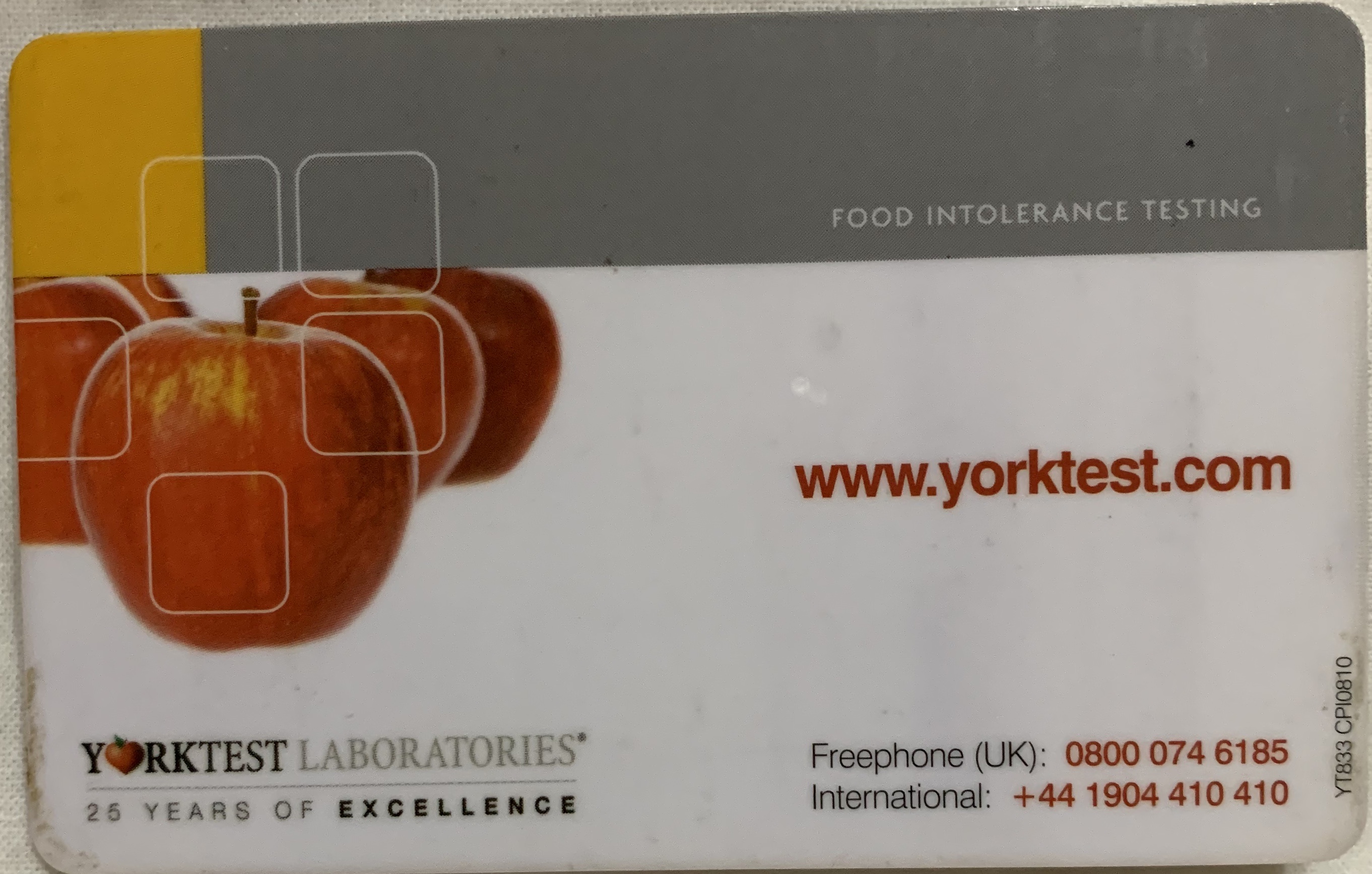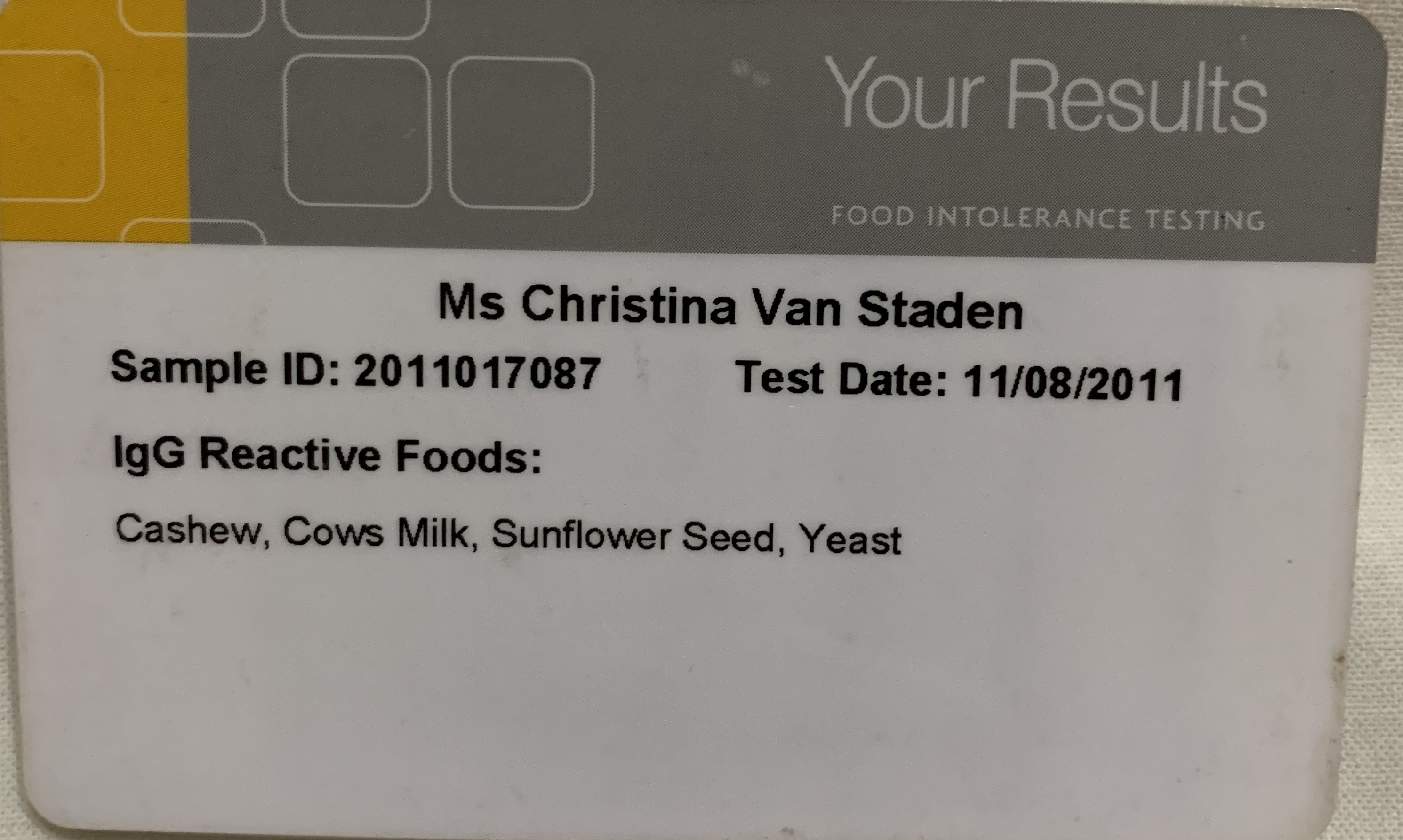 Die toets se naam is die York Food Intollerance Test. Vrek duur, maar beslis die moeite werd om te weet. En jy kry so ‘n kaart wat jy in jou handsak kan dra.