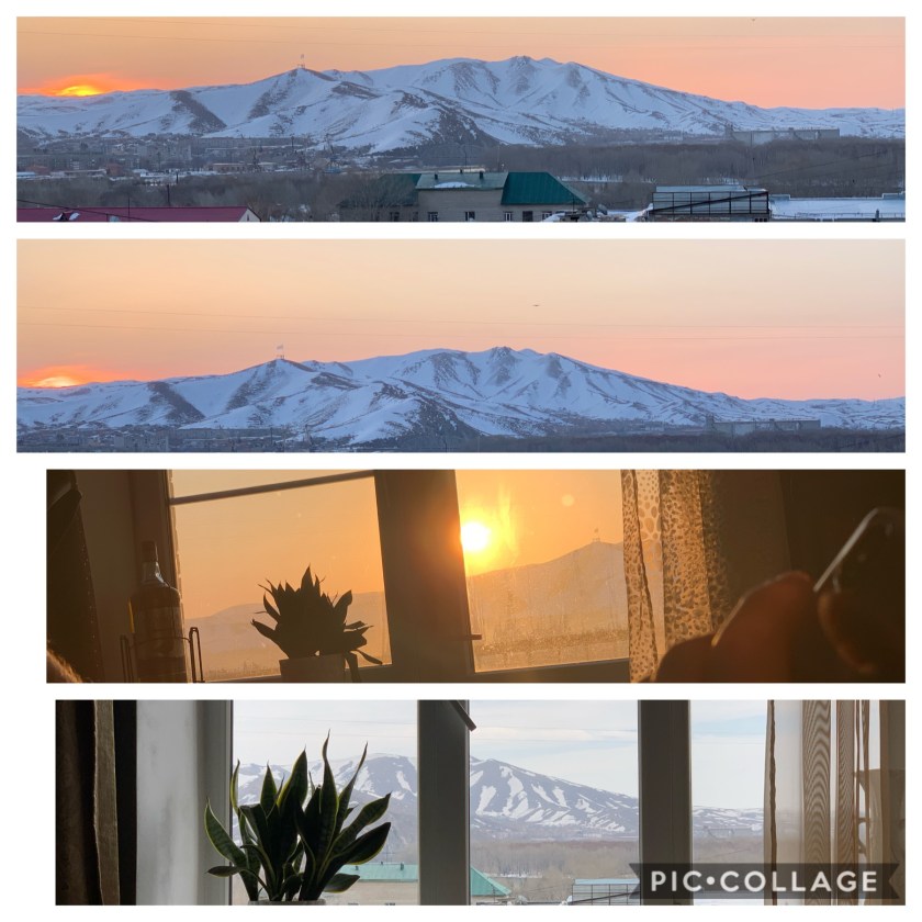 Oorkant die TV is die groot vensters wat na buite kyk. Oor die vaal geboue, die huise, om die Hollywoordagtige Kazakhstan berg vir my te wys. Daardie een wat twee weke gelede nog spierwit was.