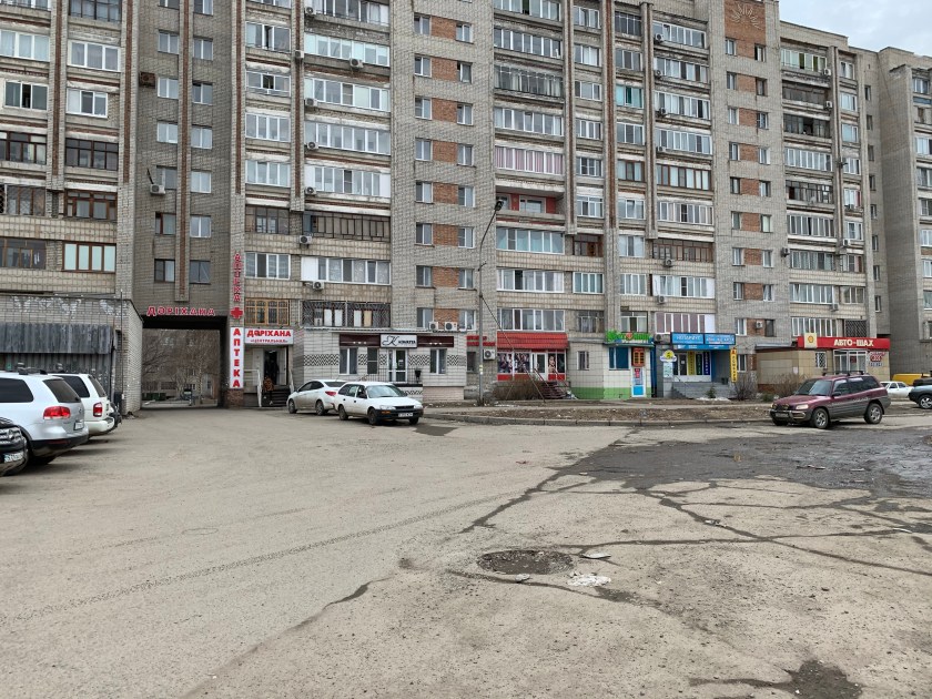 Die platter woonstelblokke in die stad lyk baie soos die een hier onder, en soos jy kan sien is die hele eerstevloer winkels. Elke winkel het sy eie ingang, jy stap nie in en binne van hoek tot kant nie. Sommige van die blokke is ook in kleure geverf, maar verf is nie ‘n goeie idee in hierdie uiterste temperature nie.