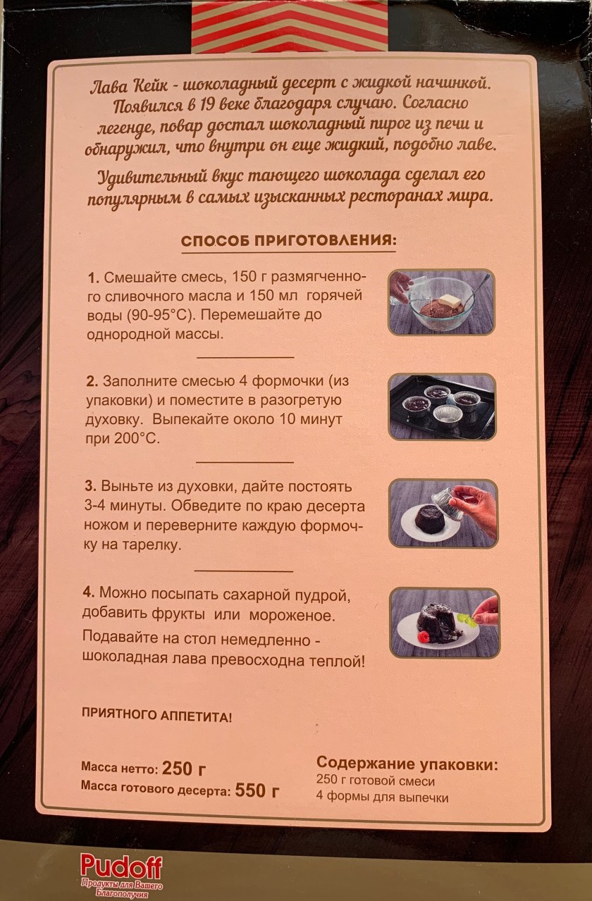 Net weight: 250 g Weight of the finished dessert: 550 g Package content: 250 g of the finished mixture 4 baking dishes Pudoff Snronoryate–