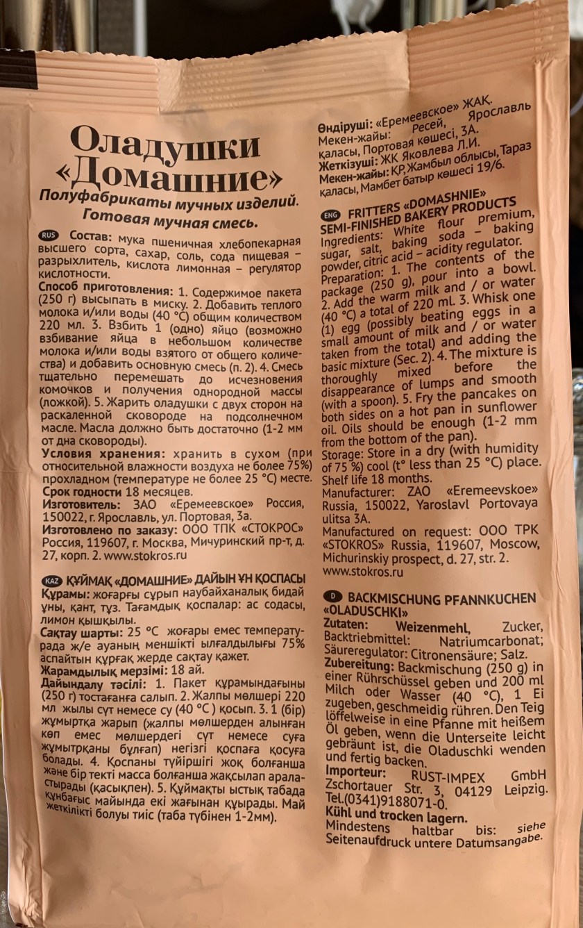 Die resep was agterop in Russies, Engels, Qazaq en Duits.