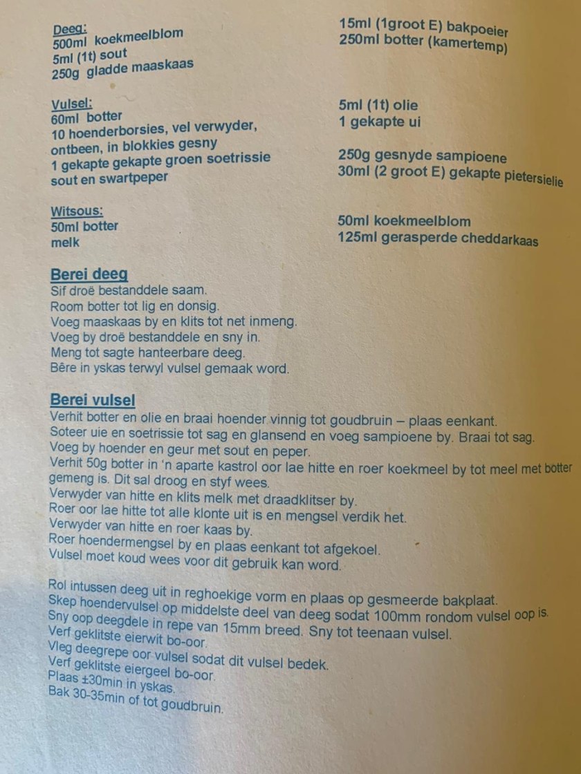 Skoonseun en dollatjie, stuur asseblief vir ma ‘n resep vir ‘n lekker chicken pie, ek is nou lus daarvoor.