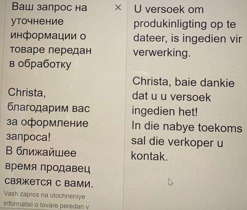 Ek het in Engels geskryf dat ek nie Russies verstaan nie, maar wil weet of hulle dit na my stad koerier, in hierdie tyd van inperking. Die antwoord het vinnig gekom. In Russies. Dat hulle my versoek verwerk. ‘n Rukkie later het ek weer ‘n antwoord gekry. Aangesien ek op my rekenaar besig was, het ek sommer Google Translate gebruik en dit na Afrikaans te vertaal.