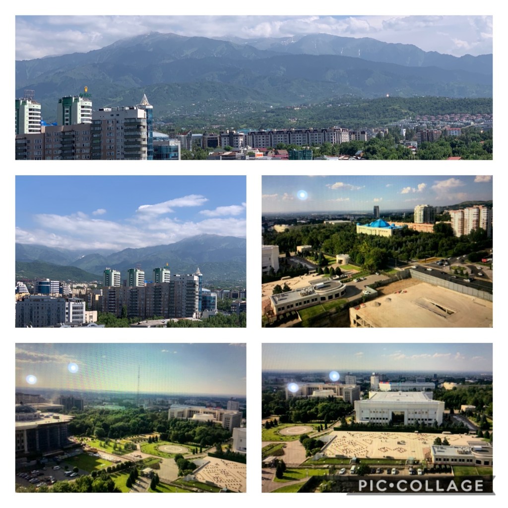 En … jy het dalkies net reg geraai, ‘n uitsig oor Almaty tot in die platteland om Almaty. Oral sien ek groen. As ek skuins by die een venster uitkyk, sien ek ‘n gedeelte van die berg.