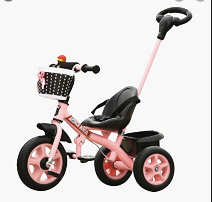 Die driewiel staan erg skuins na ons kant toe. Sy agterwiel naaste aan ons het uitgeval. In al die mandjies is speelgoed. Die kleintjie staan beteuterd met die wiel in haar hand.