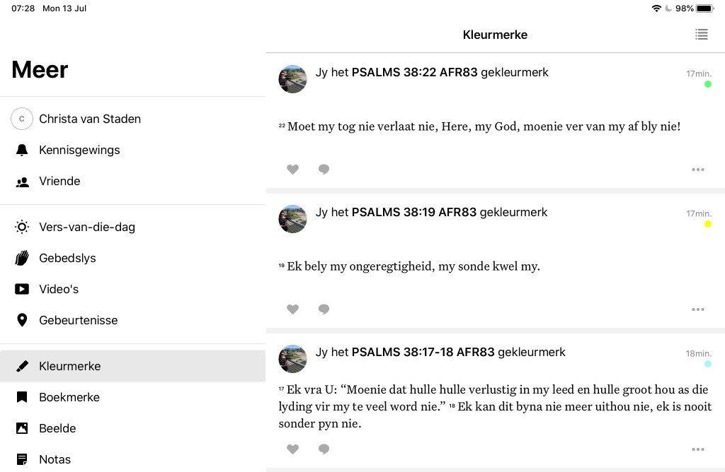 Vandag se deel van die leesplan om die hele Bybel te lees, het sulke belangrike woorde gehad. Ek het die boekmerk en die kleurmerke gebruik om dit aan te teken. As jy dan op meer kliek, kan jy na jou boek- en kleurmerke kyk om weer te lees.