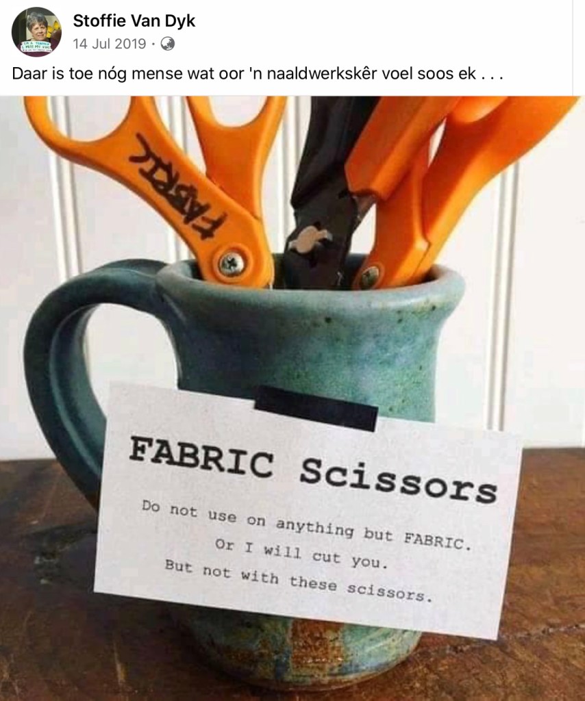 Dus kyk ek gister op Facebook so na die spotprente oor vrouens en hulle naaldwerkskêre. En ek verstaan hulle passie oor ‘n naaldwerkskêr. My vriendin Stoffie het die een gedeel.