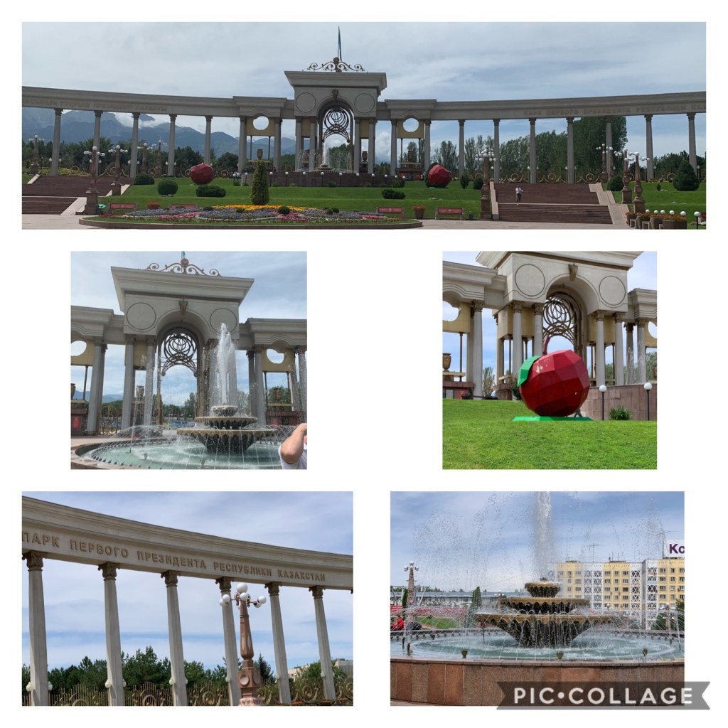 Ek kon nie die hele raam inkry nie, sal probeer las en kyk hoe werk dit. Ingang na die park toe, appel (natuurlik, Almaty = appel stad), woorde op die een kant van die pilare en die fontein uit ander hoek.