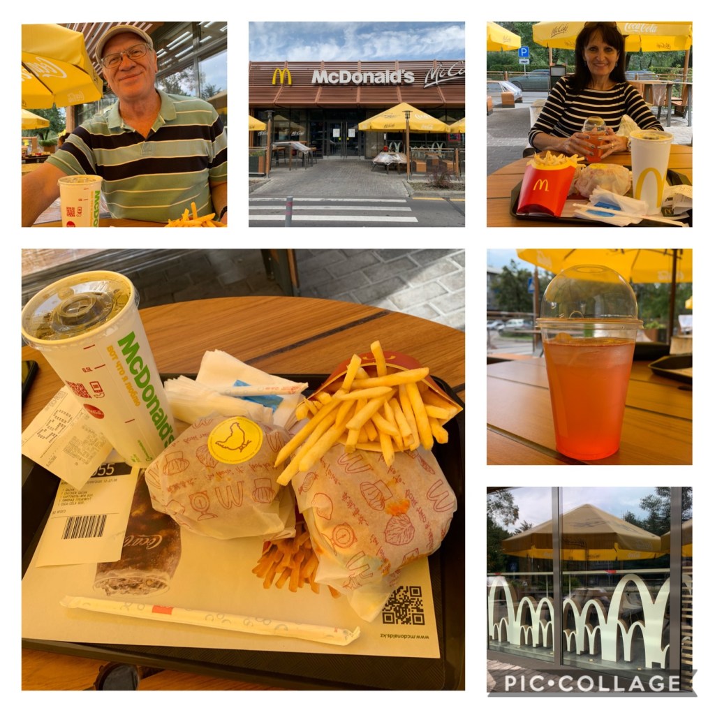 Onlangs sien ons dat Almaty ‘n McDonalds het. En ‘n dag later is ons lus vir McDonalds vir middagete. Met Dusty by ons is dit maklik, 10 minute se ry daarheen, 20 minute vir bestel en nog tien terug, dan eet ons sommer by die huis. Oor etenstyd.