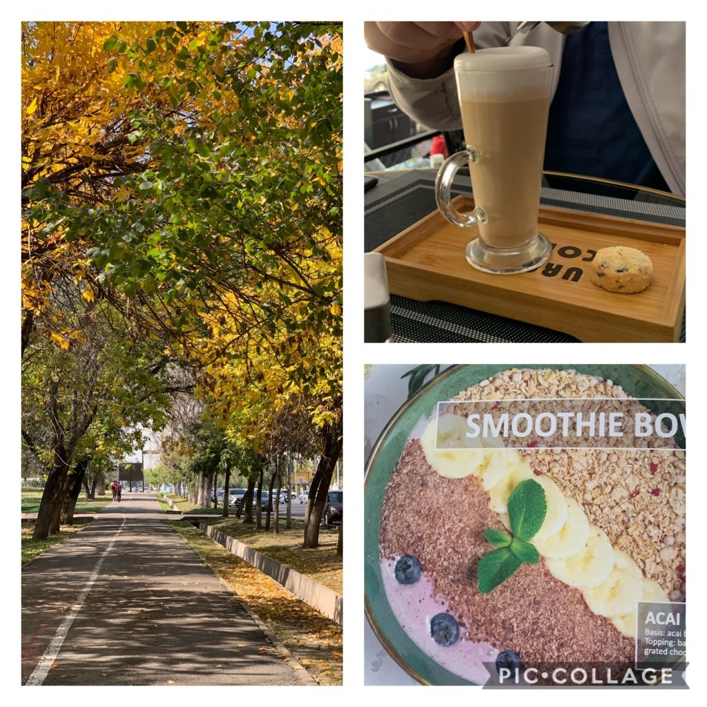 Onder is foto’s van die lanings bome waaronder ons stap om by die restaurant uit te kom wat besig is om van grasgroen na ougoud te verander, lattté wat manlief gekies het en die smoothie in ‘n bord.