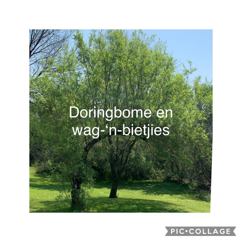 Blogvriendin Woordnoot skryf vandag oor doringbome. En toe is ek sommer lus om ook te skryf. Veral omdat ek een in ons tuin laat afkap het. Ene wat die gras versmoor, ons het hom op verkeerde plek geplant. Ek wil oor twee soorte bome met dorings skryf wat by ons langs die rivier groei.