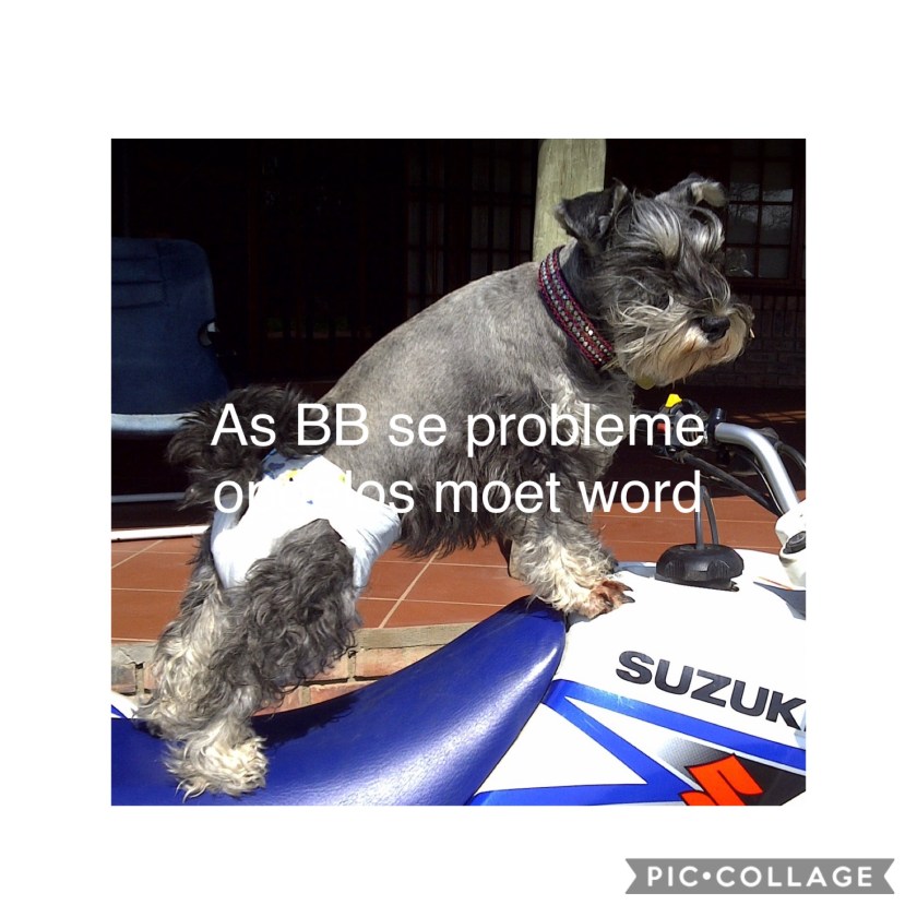 BB is my miniatuur Schnauzertjie; sy is so bietjie meer as tien jaar oud. As jy hier lees, sal jy verstaan hoe ek my hart styf toe mies maak terwyl ons in Kazakhstan geleef het. Om nie aan haar en my ander woefkinders te dink nie.