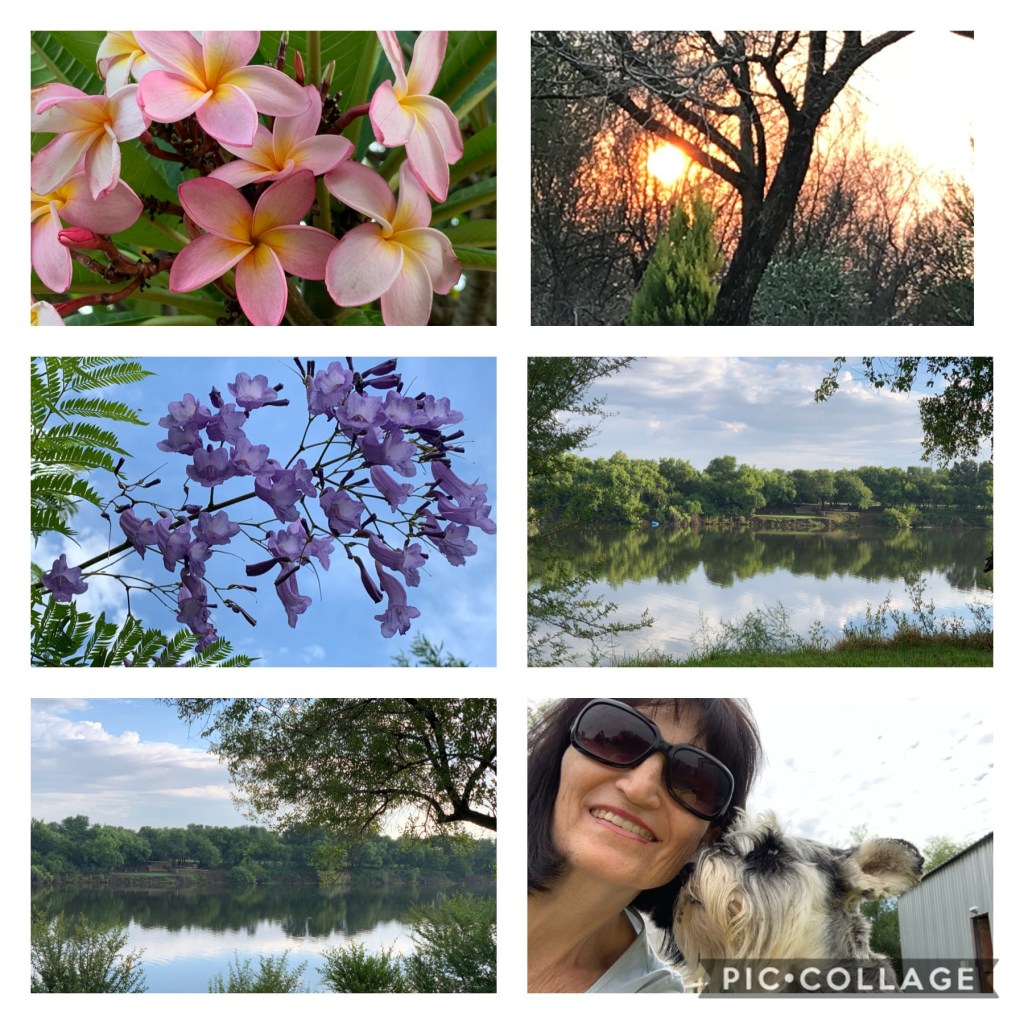 Foto’s: My frangipani (self geplant) se blomme, sonsondergang by die rivier, my Jakaranda (self geplant), Vaalrivier by ons plek naby Bothaville, ek en my liefie woef – BB weet sy mag my snoet, maar nie lek nie – Schnauzers weet dit sommer vanself …