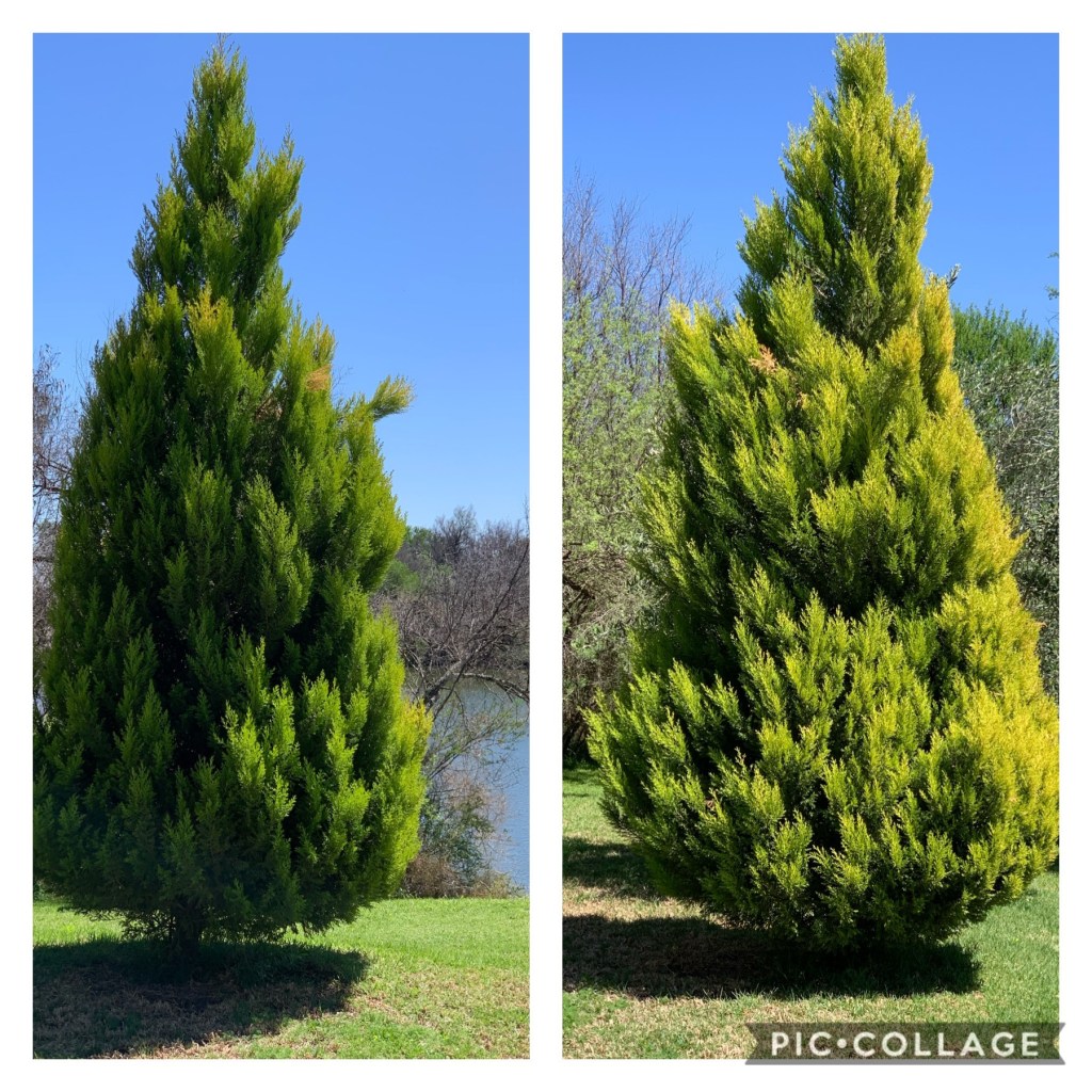 Die arme boompie het onder ons vorige wag, wat ook die gras versorg het, gely. Hy het daarteen gestry, maar ek is seker hy het die kabel van die grassnyer om die boompie gedraai om te keer dat hy die kabel raaksny. En in die proses het hy die boompie se takkies na onder afgery. So erg dat die boompie maar oes gelyk het (foto).