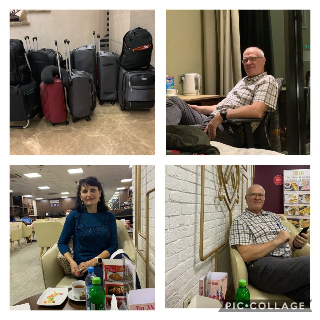 Foto: Ons bagasie, wag vir tyd om om te gaan in hotekamer, besigheidsklas sitkamer op Almaty lughawe, internasionale kant. Die nasionale kant s’n is piepklein.