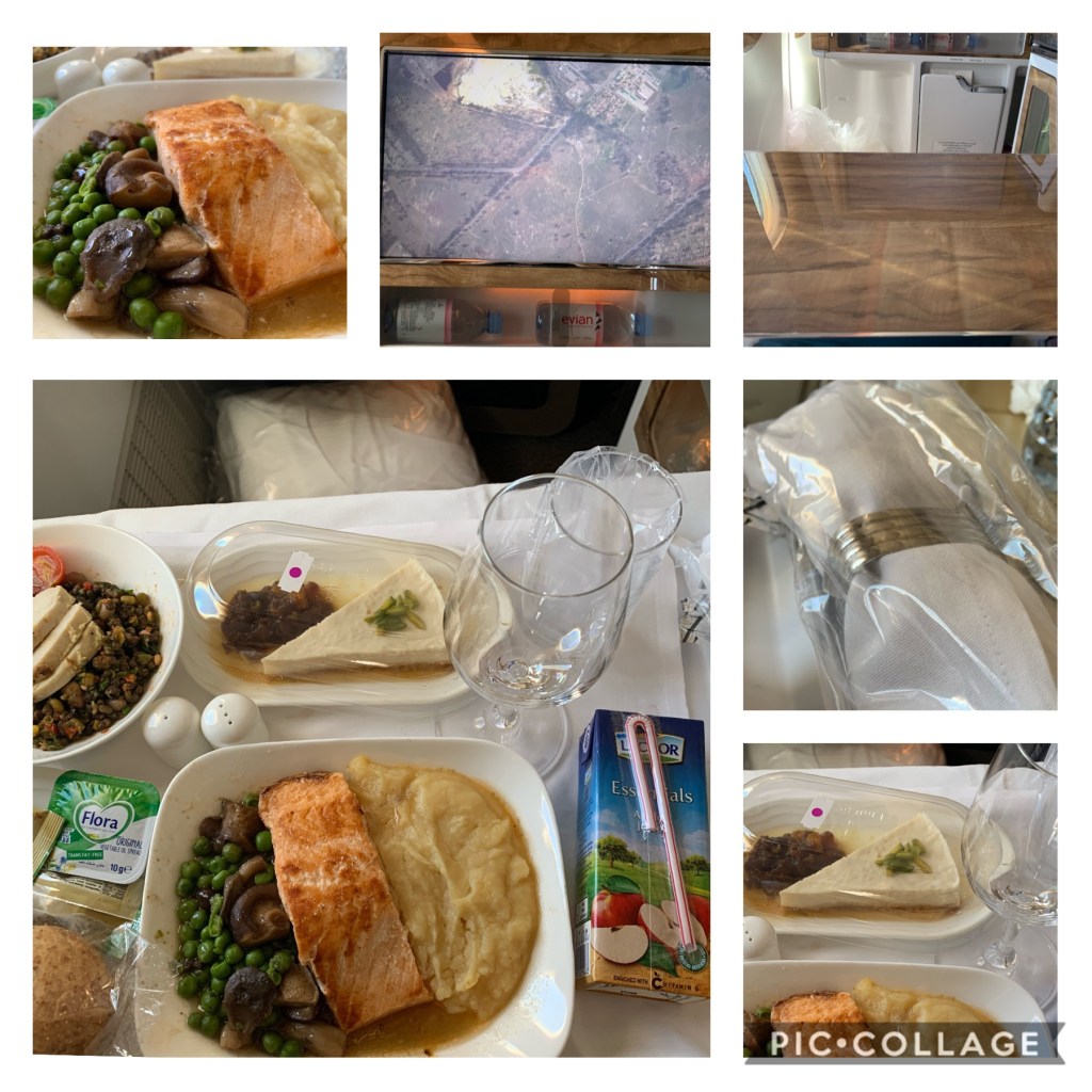 My stoel het soos ‘n bed platgeslaan, tot heeltemal plat. Aan die voorkant was ‘n baie groot TV-skerm, met ‘n rakkie agter glas waar twee waterbottels was. Aan de kant van die sitplek was daar koeldranke, ‘n glas glas en nog water. Regs bokant my kop was daar ‘n ipad-grootte skerm wat ek kon gebruik om die TV te beheer.