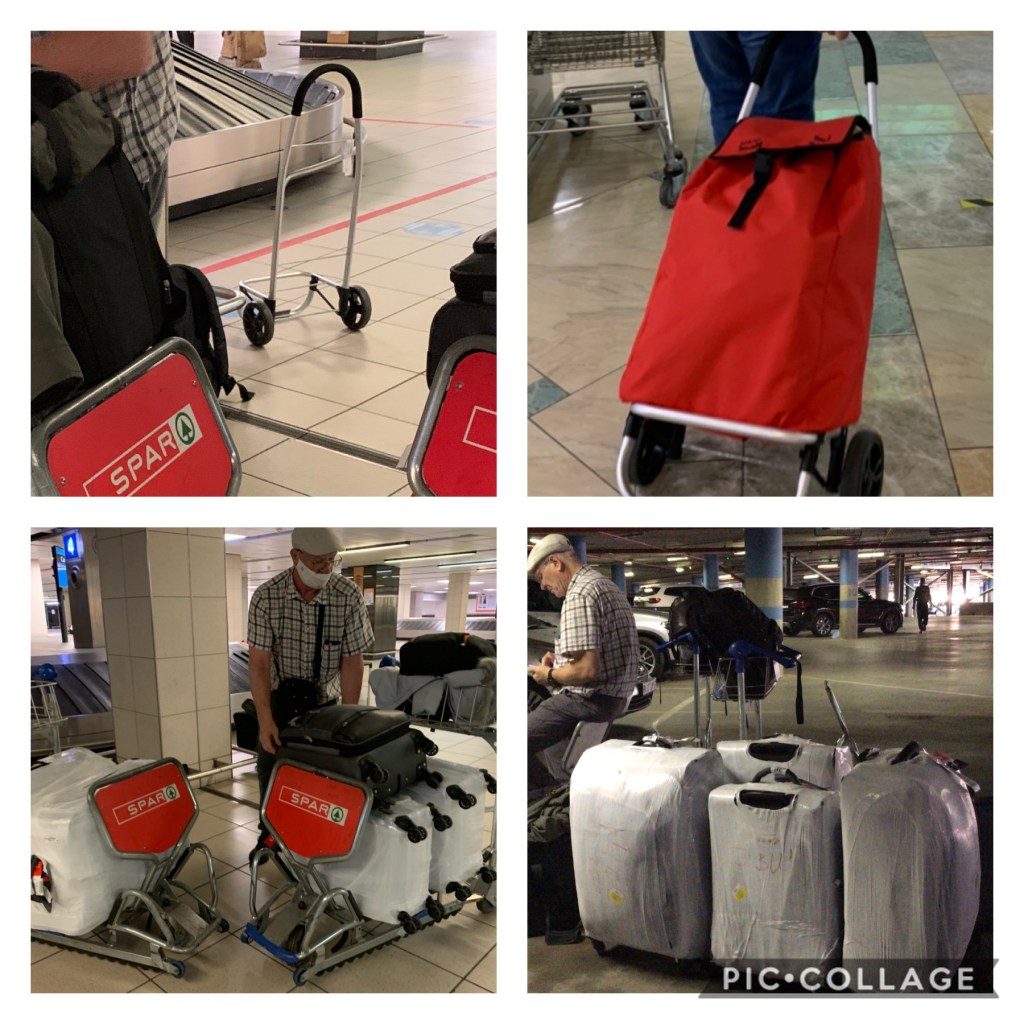 En toe staan ons by die carousel om ons tasse te kry. Wat met M&C op die wit plasties gemerk was om hulle uit te ken. Anders as gewoonlik, was ons tasse heel eerste. Ons het twee trollies bykans onmiddelik tjok en blok gepak.