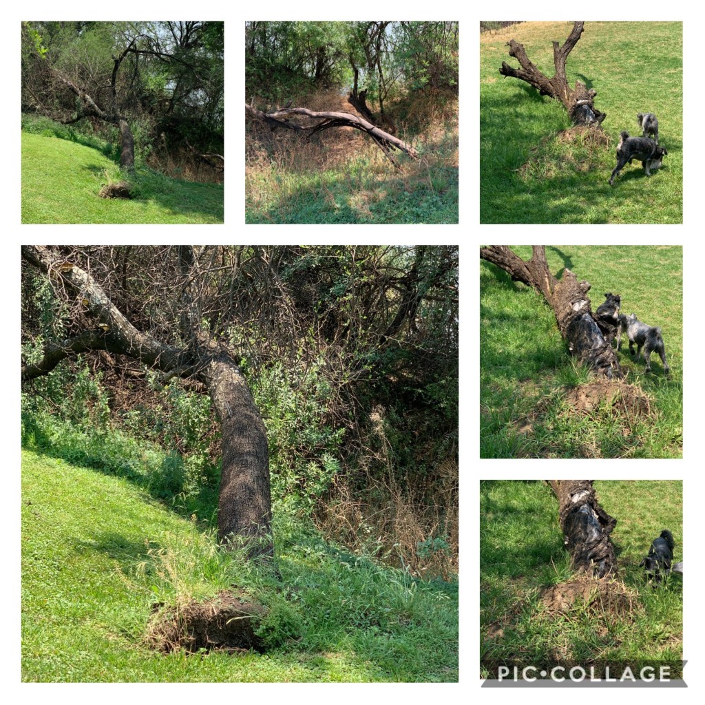 Daar waar hy gestaan het, is die grond tydens die val skaars versteur. Ek kan nie glo dat sulke hoë bome op sulke pieperige worteltjies staatmaak nie (kyk foto’s).