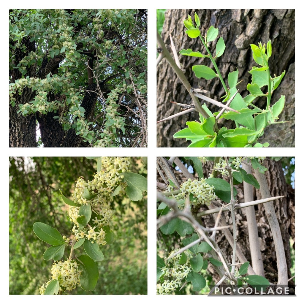 En toe ontdek ek vanoggend nog ‘n soort doringboom toe ek gaan foto’s neem. Blare soos die wag-‘n-bietjie, dorings soos die doringbome. Maak soort van blommetjies op die oomblik, daarom het ek die verskil nou eers opgemerk. Wonder watter soort boom dit is?