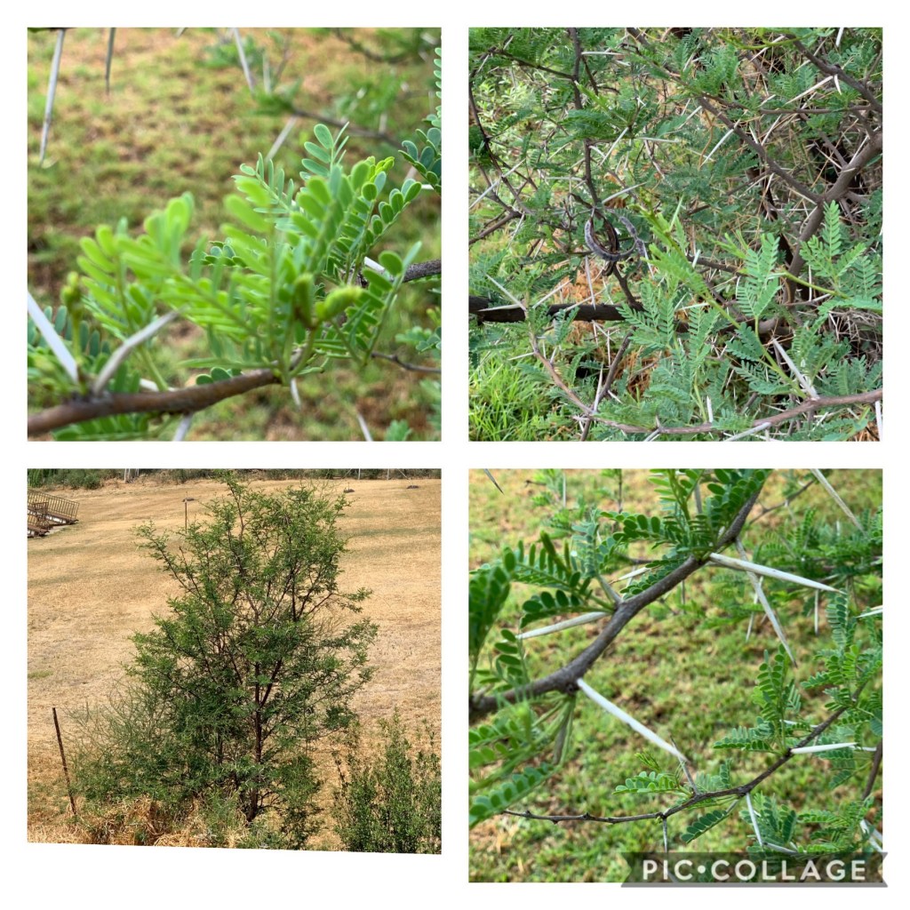 Massiewe dorings tussen die blare versteek. Blare soos die wag-‘n-bietjie, dorings amper erger as die doringbome. Ken jy dit? Amper soos kruising tussen die twee.