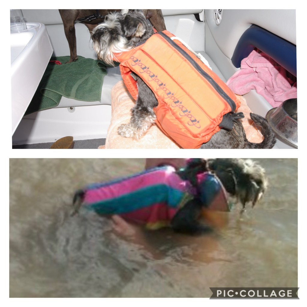 Soos ek geskryf het, Bb het oral saam gegaan. Dus bly sy ook nie in die huis as ons met die boot op die Vaal se water is nie. Ek sal haar ou vaal lyfie glad nie in die water van die Vaal herken nie, daarom moet BB, soos al die ander op die boot, ‘n veiligheidsbaadjie dra.