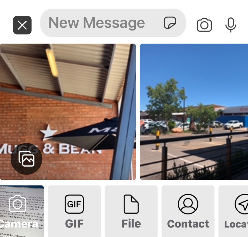Jy kan teksboodskappe stuur, bel, video-oproepe maak en stemboodskappe stuur. As jy op die plusteken druk, kan jy foto stuur, foto neem en stuur, GIF, lêer, kontak of ligging stuur. Ek hou van die groot blokke waarop jy kan kliek daarvoor.