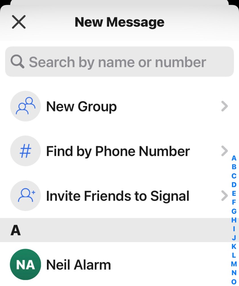 Jy kan ‘n groep begin, iemand met sy #telefoonnommer kry of vriende na Signal nooi. Jou lys van kontakte wat ook Signal het, word dan alfabeties gelys, maar jy kan ook op die blou alfabet kliek om byvoorbeeld vinniger na Van Staden te gaan.