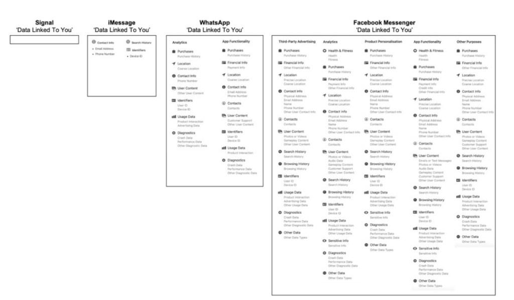 Ek het na Signal oorgeskakel, kyk gerus na die prent bo om te sien dat Signal die minste PI versamel. Die eienaar en ontwikkelaar van WA het FB verlaat en hom by Signal geskaar – omdat hy nie daarmee saamstem dat FB toegang tot PI kry nie. As hy, wat in die raad gedien het en die diepste geheime van FB ken, padgegee het, volg ek hom beslis.