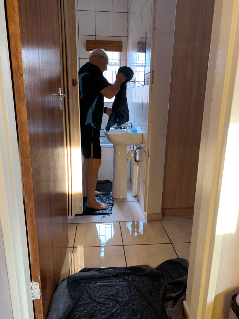 Toe hy goed gesukkel het, gooi ek handdoeke op die vloer. Want dit is wat ek doen as ek per ongeluk ‘n kraan oopgelos het. Dit het al gebeur, ek maak seker ek maak ‘n knoop in my oor as water iewers oop is. En haat die skoonmaak daarna.