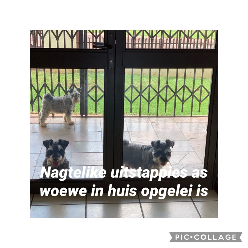 Soms gebeur dit wel dat my Miniatuur Schnauzers ‘n glipsie in die huis kry. Maar dit is elke keer my skuld. Ons was te lank dorp toe, ek het hulle nie voor ons weg is gou vir ‘n draaitjie gevat nie. Daarom het ek wel rate teen woewe wat indie huis piepie.