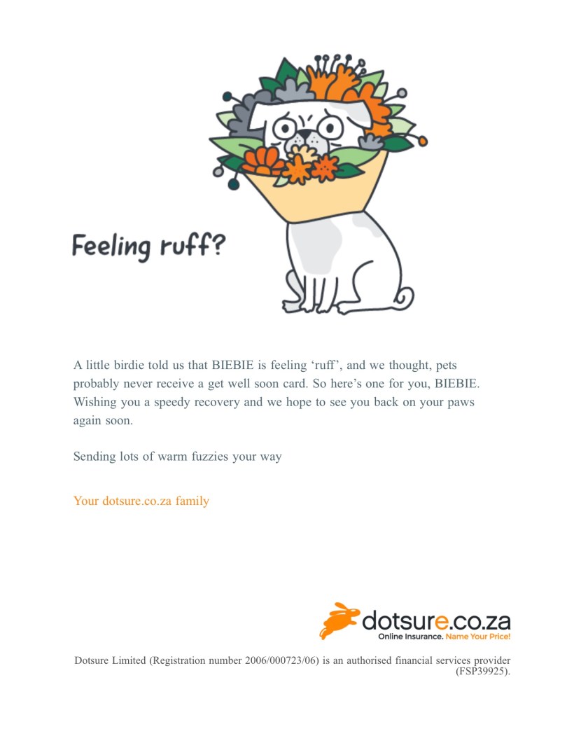 En toe kom die e-pos wat my verras. BB kry haar eie word-gou-gesond-kaartjie.