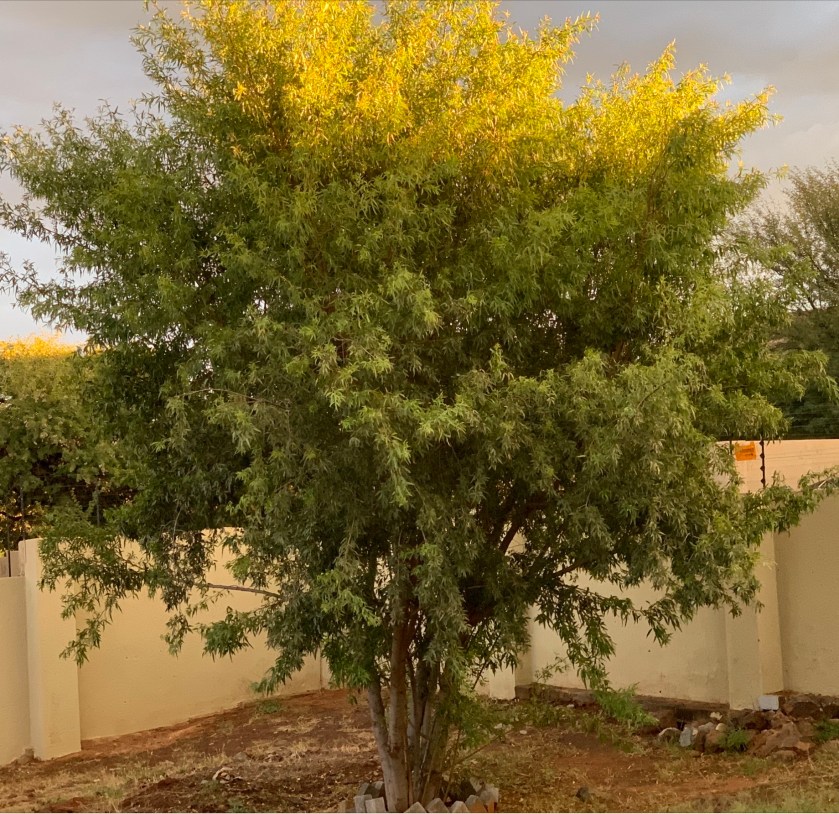 Ons het mos net voor gras, agter is dit grond en dorings. Dit trek my dadelik om ‘n foto te gaan neem as die son so op die bome speel, die boonste blare in ‘n ander kleur verander. Mens twee keer laat kyk om seker te maak dat jy nie verkeerd kyk nie. En dan gryp ek my kamer, voor die oomblik verby is.