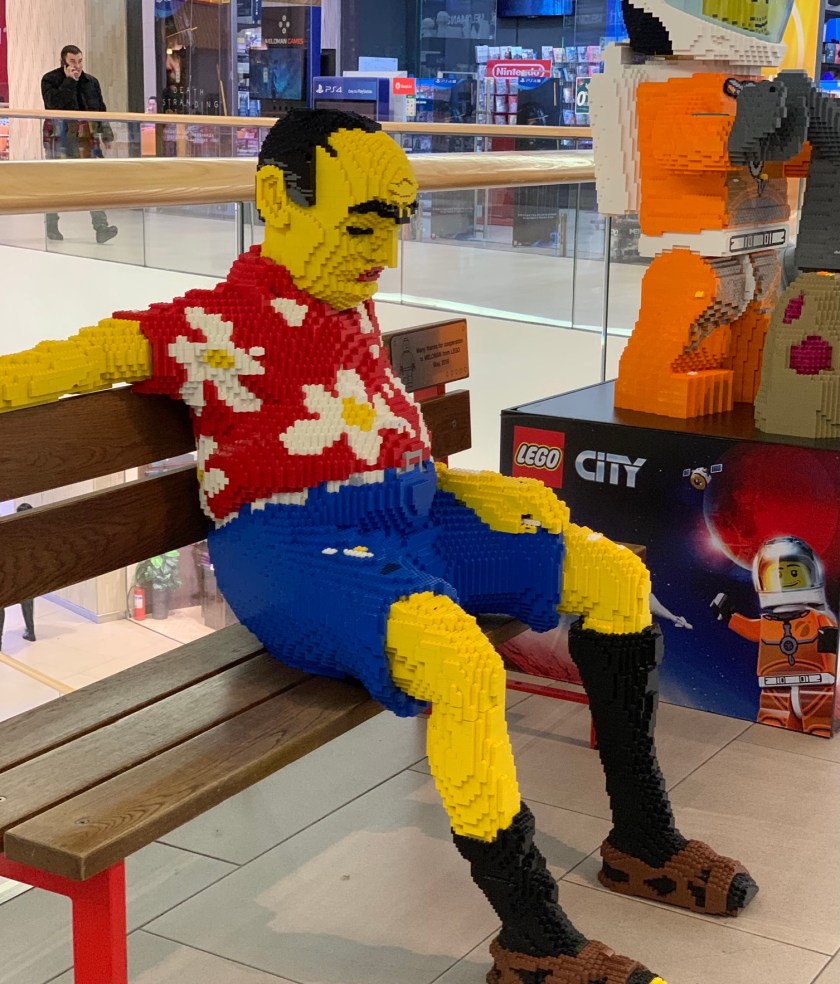 Die foto is in die Dostyk Plaza winkelsentrum geneem, een van die sentra waar die rykeres koop. Ons het stapafstand daarvandaan tydens die inperkings gebly, dus was dit ons inkopiewinkel. Die man is op die tweede vloer op een van die bankies uitgestal. Vir my het hy hartseer of selfs moedeloos gelyk. Maar ek moes hom afneem, by kleinkinders is baie lief vir Lego.