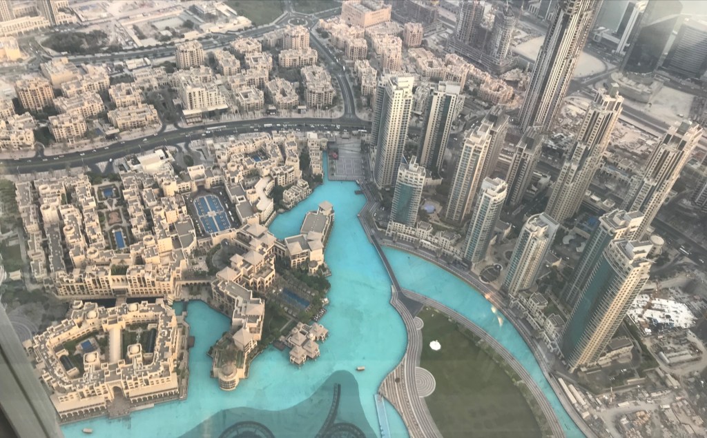 Dit het ‘n uitsig op die musikale waterfonteine by die Dubai Winkelsentrum daar ver onder. Die foto is op 16 Augustus 2018 geneem, ‘n dag voor my verjaarsdag. Ons het slap chips bestel, dit was heeltemal te duur om enige iets anders te wil eet, maar dit was absoluut die moeite werd. Die klein wit en rooi reghoeke op die blou gedeelte is groot bote, wat mense nader aan die fontein bring.