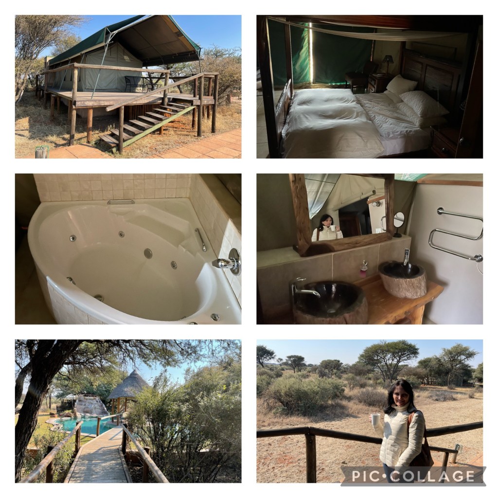 Nadia het ons genooi om na een van die tenthuise te gaan kyk. Moenie dat die term jou verwar nie. Dit het ondervloerverhitting, ‘n regte toilet, ‘n spa hoekbad, ‘n hemelbed, en pragtige, swaar, hout meubels in die tenthuis. Lyk veel eerder soos ‘n kamer in ‘n 5-ster hotel as ‘n tent. Die tente staan nie op die grond nie, hulle is gelig omdat die tenthuise ook ‘n dek te bied vanwaar mens oor die omgewing kan uitkyk. En so terloops, die huise is nie na aan mekaar nie, jy kan wegraak in jou eie wêreld. Asof jy alleen in die wildernis is.