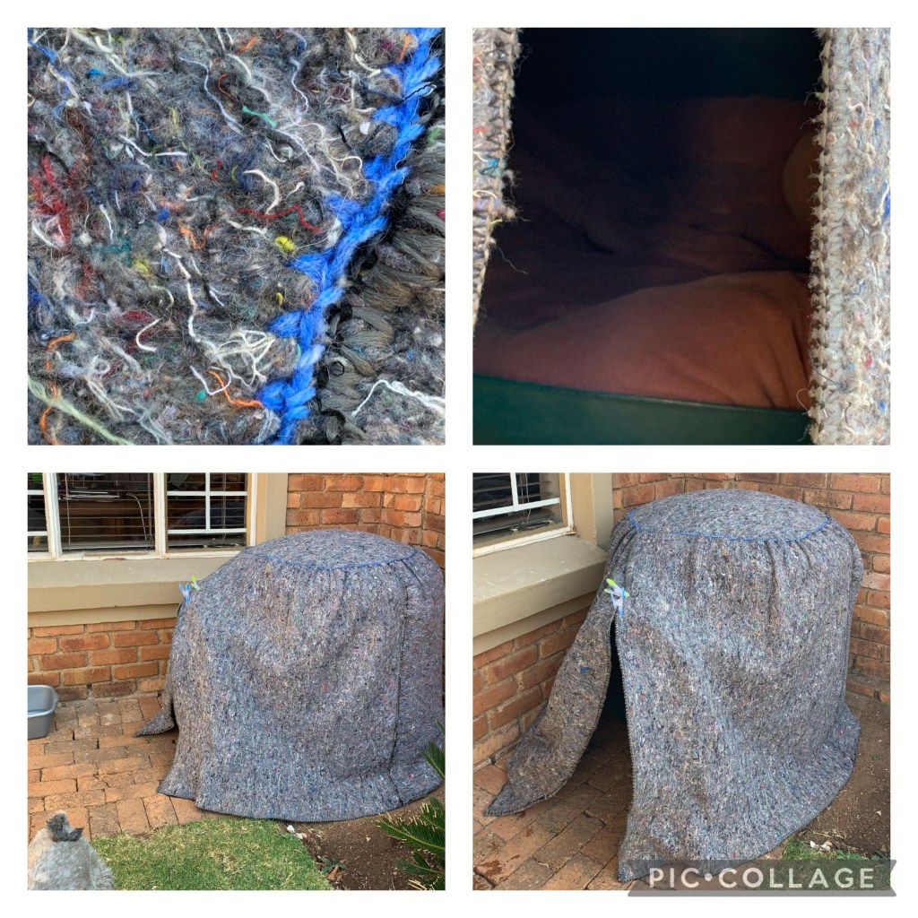 Drie van die kombersies gaan bykans rondom die ronde huisie, regte hoogte. Toe knip ek ‘n reep van die vierde een af om dit mooi rondom te kan plaas. En oo ‘n ronde gedeelte vir bo – waaraan ek die ander kan vaswerk.