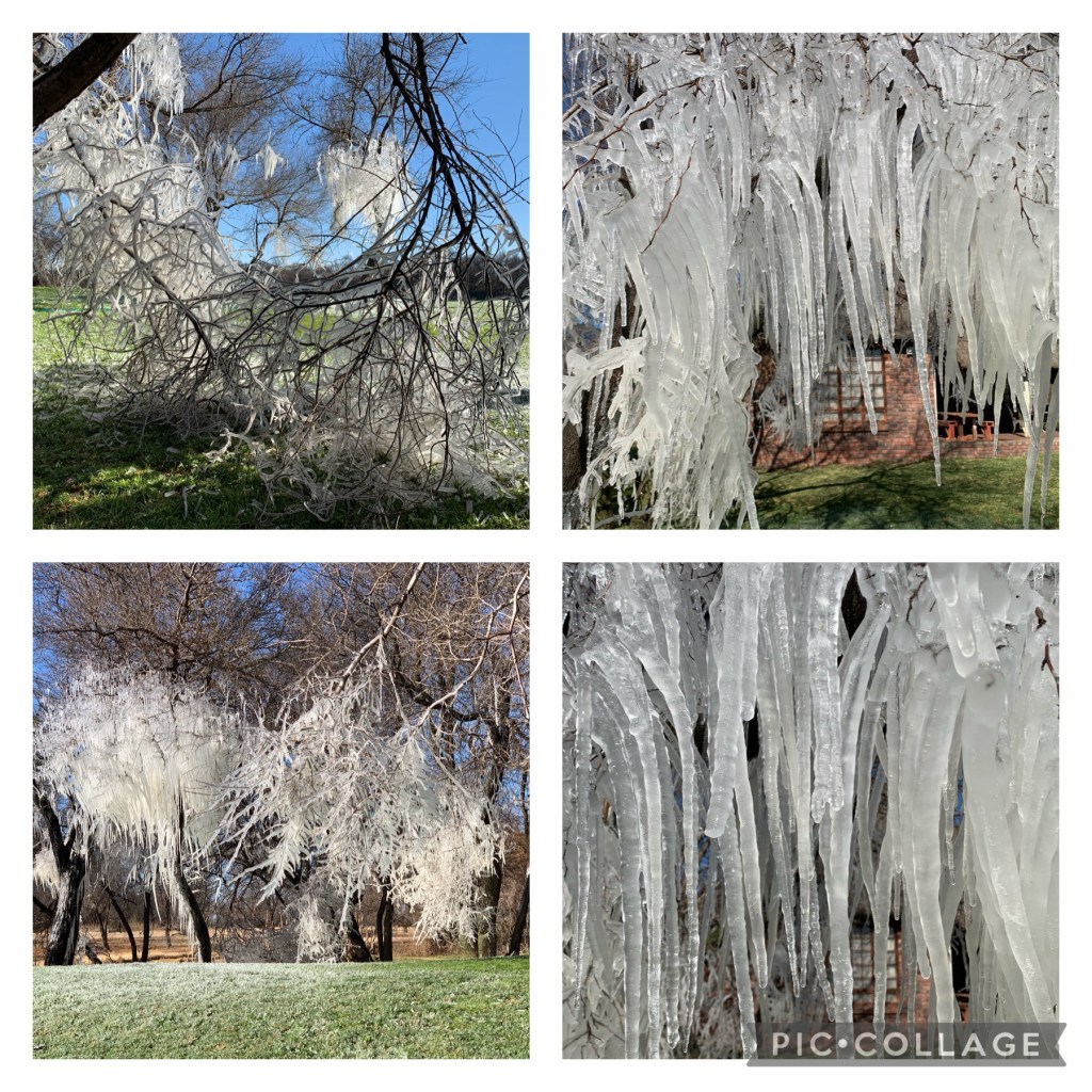 Die tweede groep foto’s wys hoe die bome gelyk het. asof ysswaarde aan die takke vasgemaak is. Die stalaktiete het natuurlik gevorm soos wat water teen bevrore gedeeltes afgeloop en gevries het.