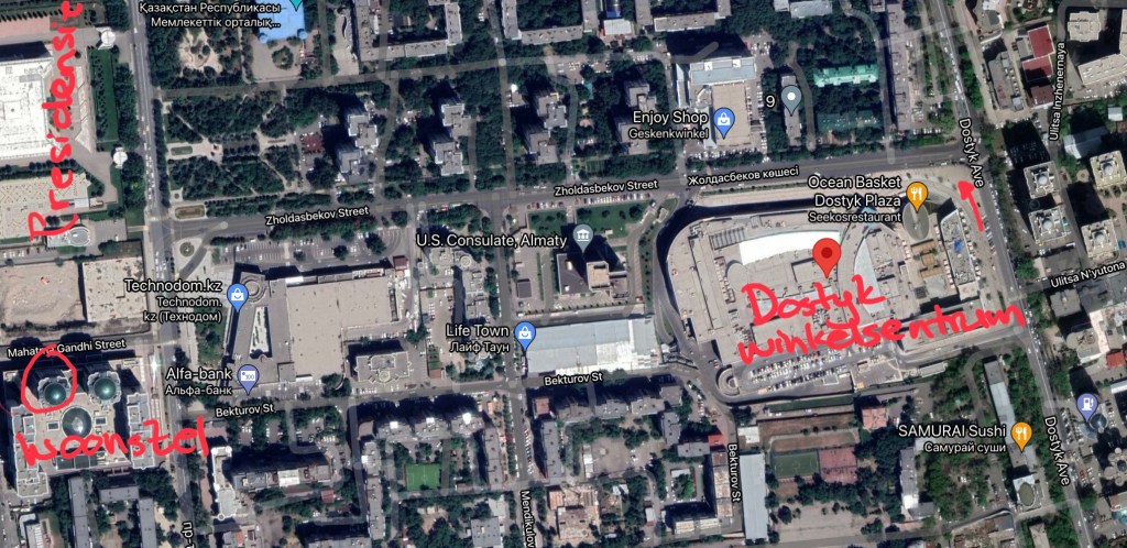 Dostykstraat is ‘n baie besige straat, met breë sypaadjies en baie voetoorgange. Die straat verbind die onderste deel van die stad met Shymbulak ski-oord wat hoog in die Altai-berge geleë is. Die straat voor is Zholdasbekovstraat, wat tussen die Dostykstraat en die president se huis loop. Ek het ons woonstel ook op die kaart gemerk.