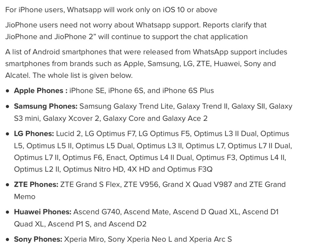 Wat iPhone betref, gaan die iPhone 6, 6S en SE nie meer WhatsApp kan gebruik nie. Vodacom het my vriendin in die Wes-Kaap (jy ken haar Seegogga) byvoorbeeld persoonlik laat weet dat sy haar iPhone 6 moet gaan opgradeer as sy WhatsApp na 1 November wil gebruik omdat WhatsApp daarna nie meer op haar foon gebruik sal kan word nie.